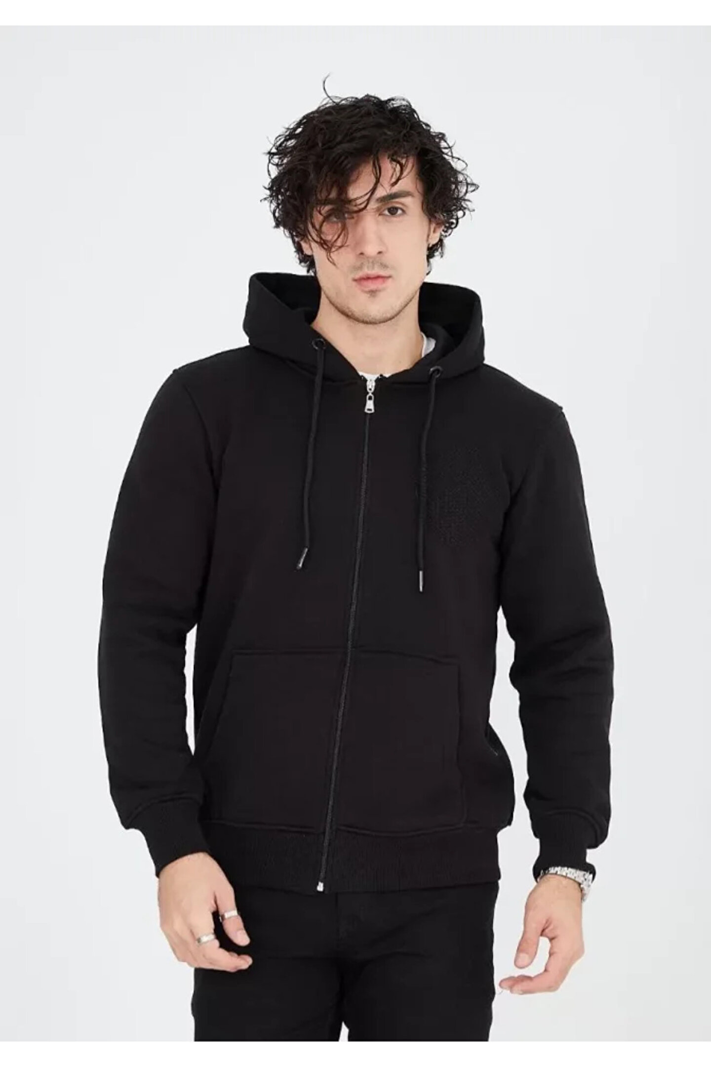 Unisex Tam Fermuarlı Kapşonlu SweatShirt - Siyah