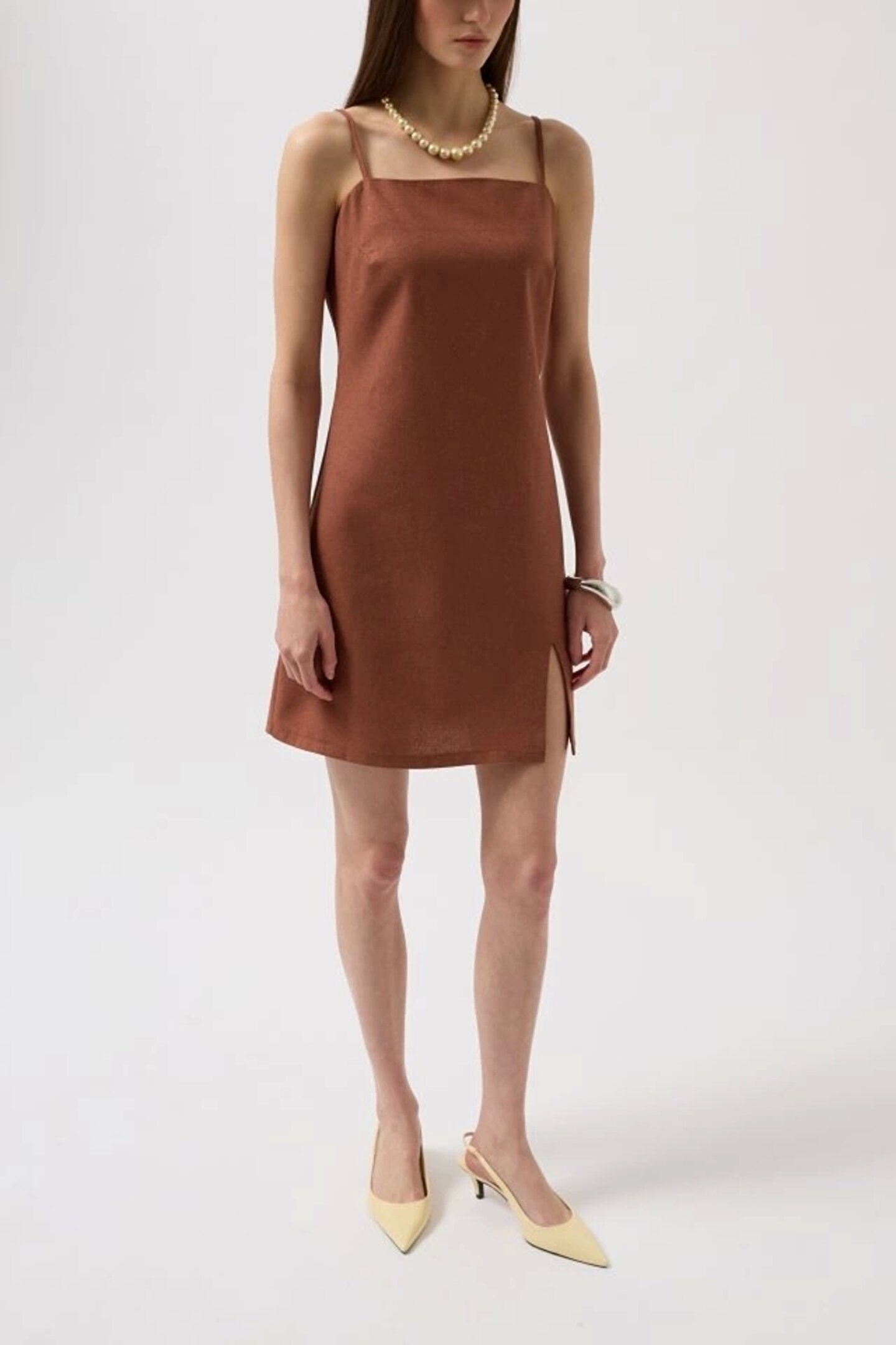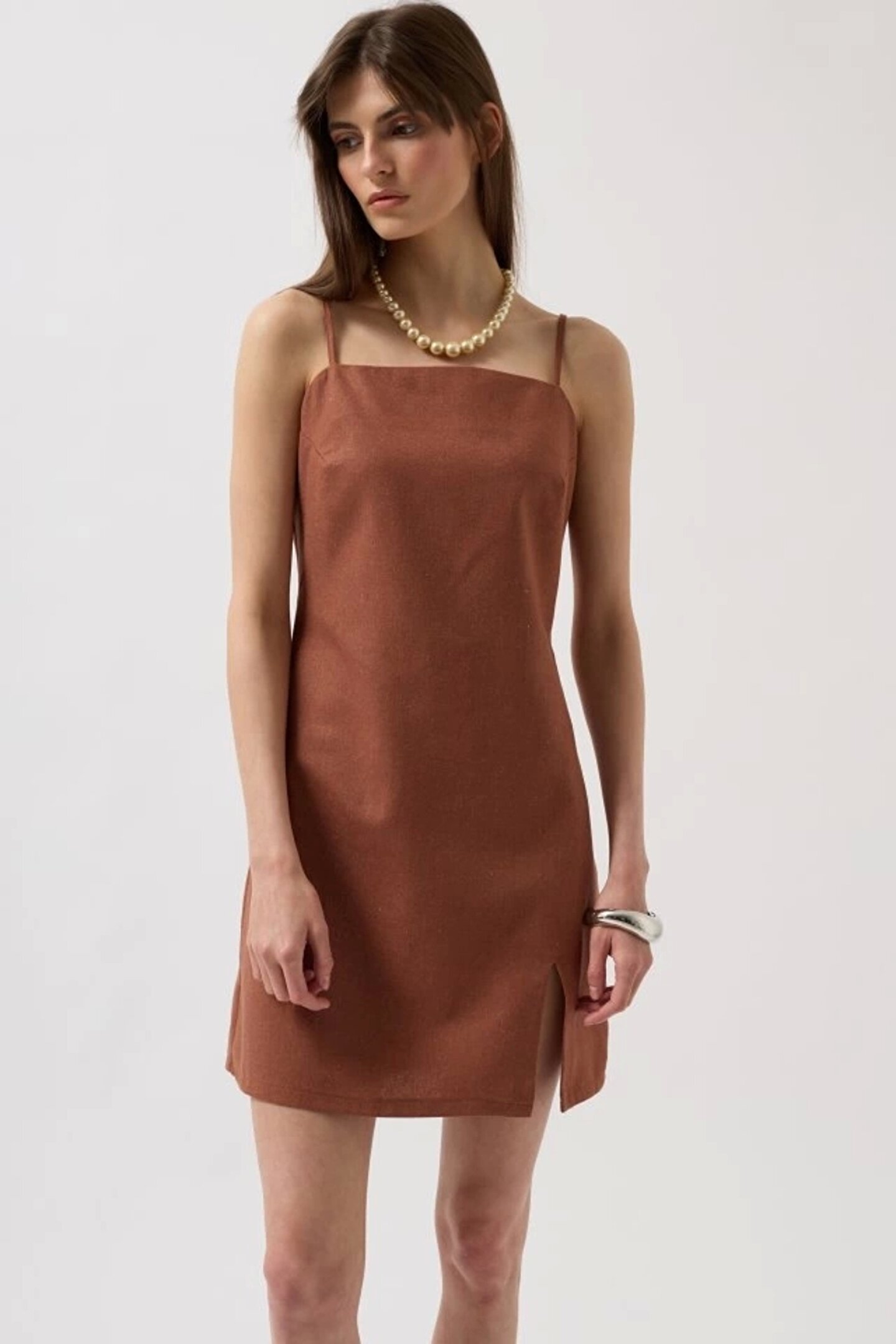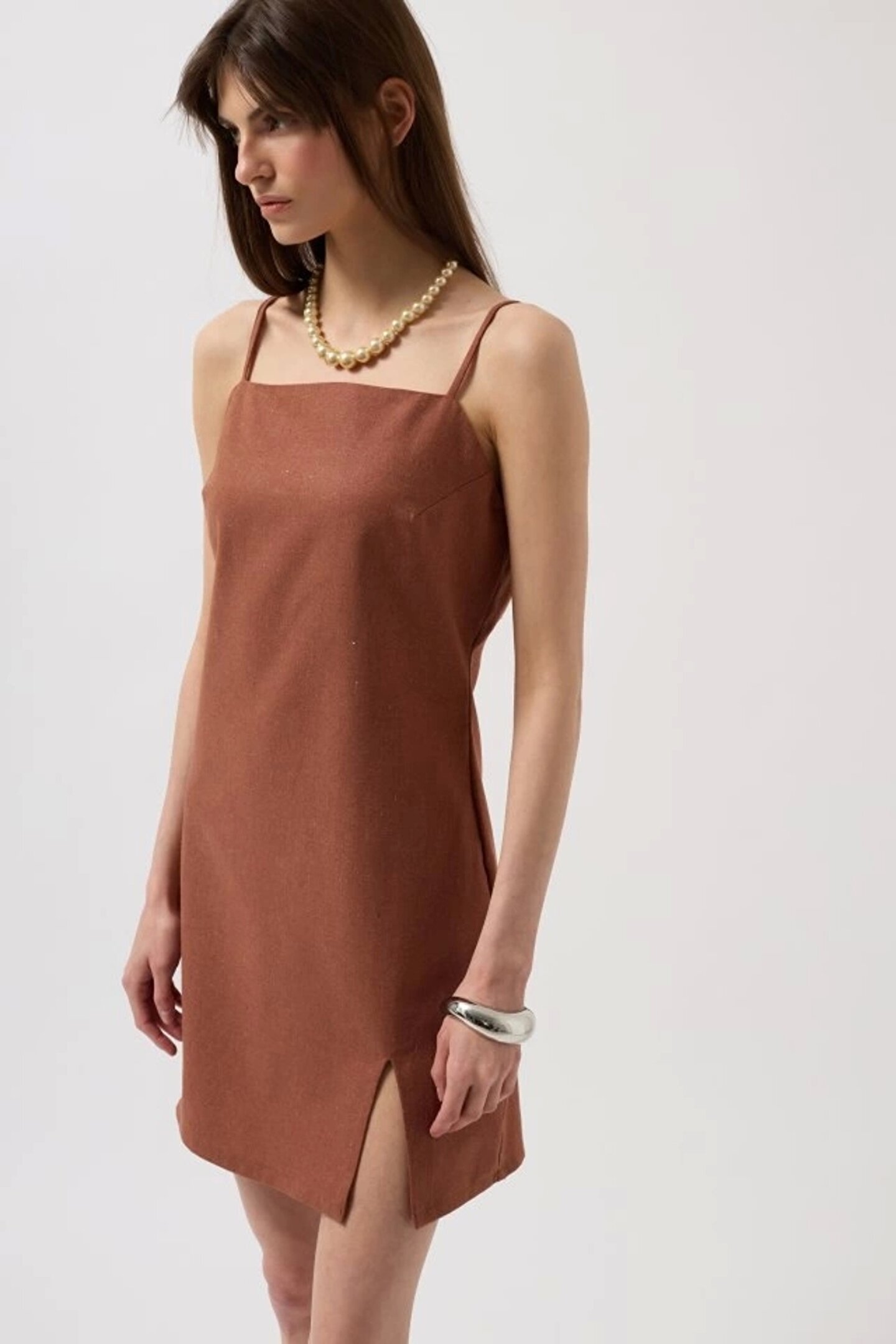 Silerra İp Askılı Yırtmaç Detay Keten Mini Elbise
