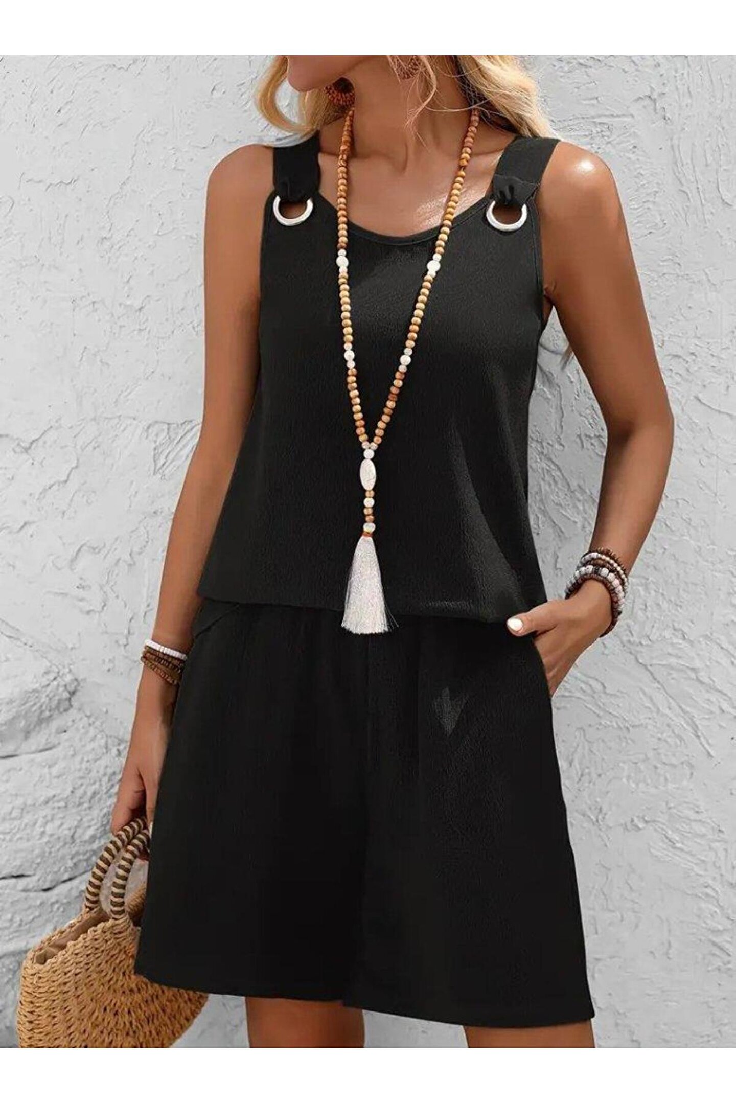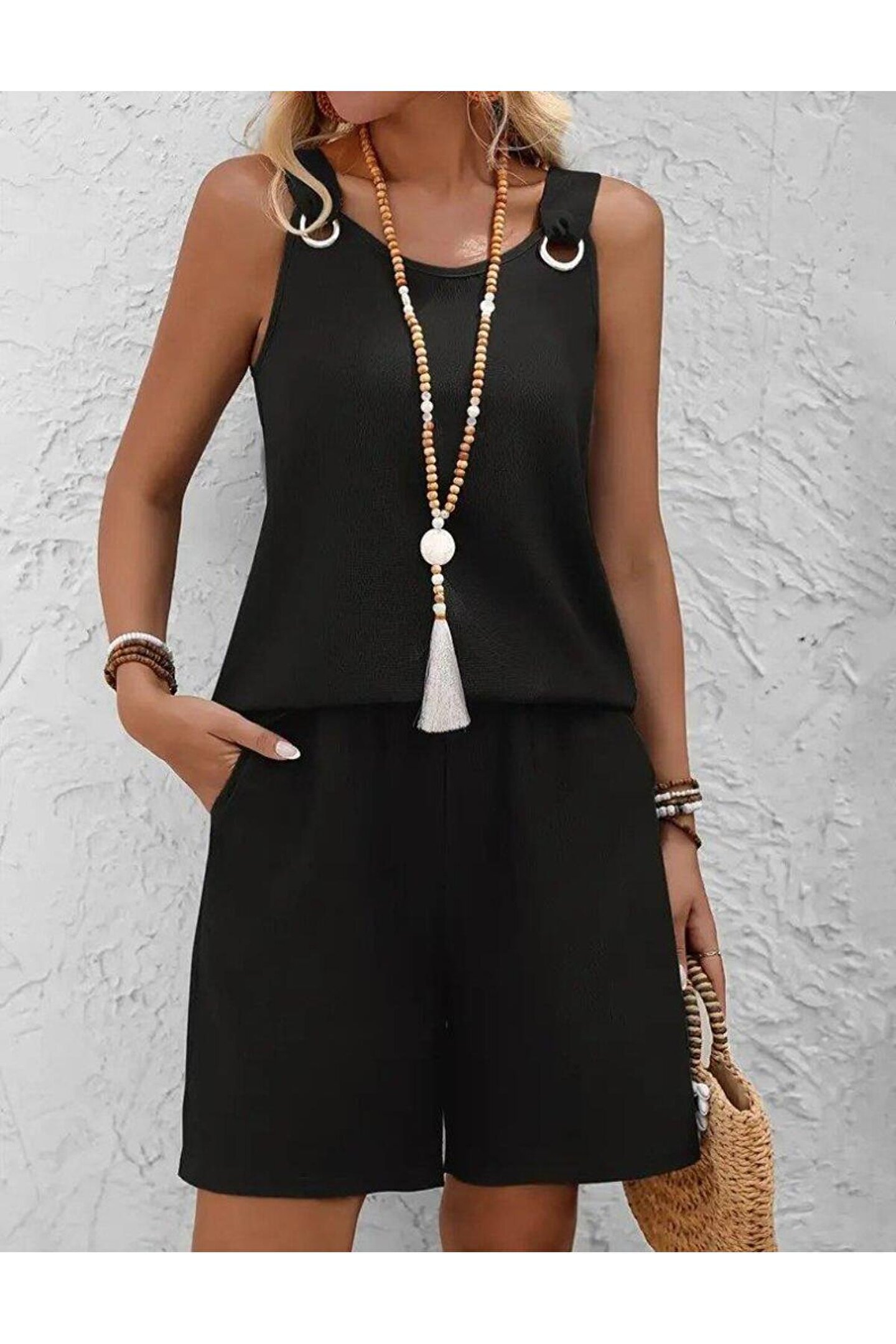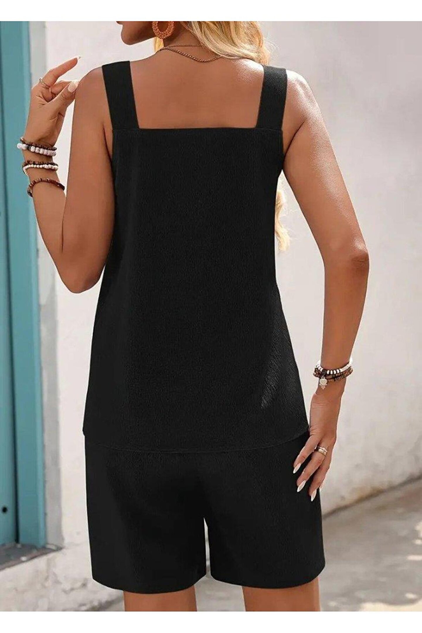 Silerra Kadın Askılı Yuvarlak Yaka Kuş Gözü Detaylı Bürümcük Bluz Ve Short Ikili Takım
