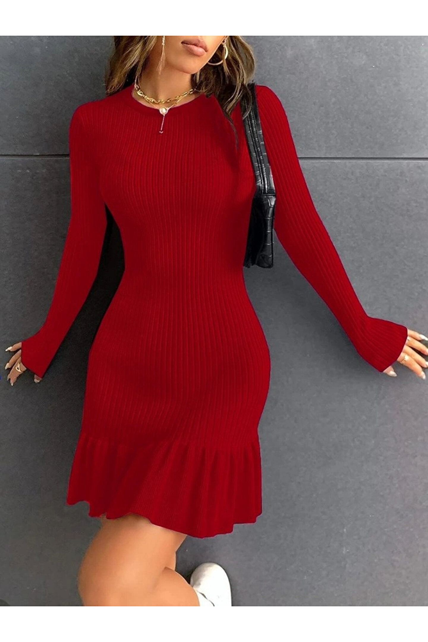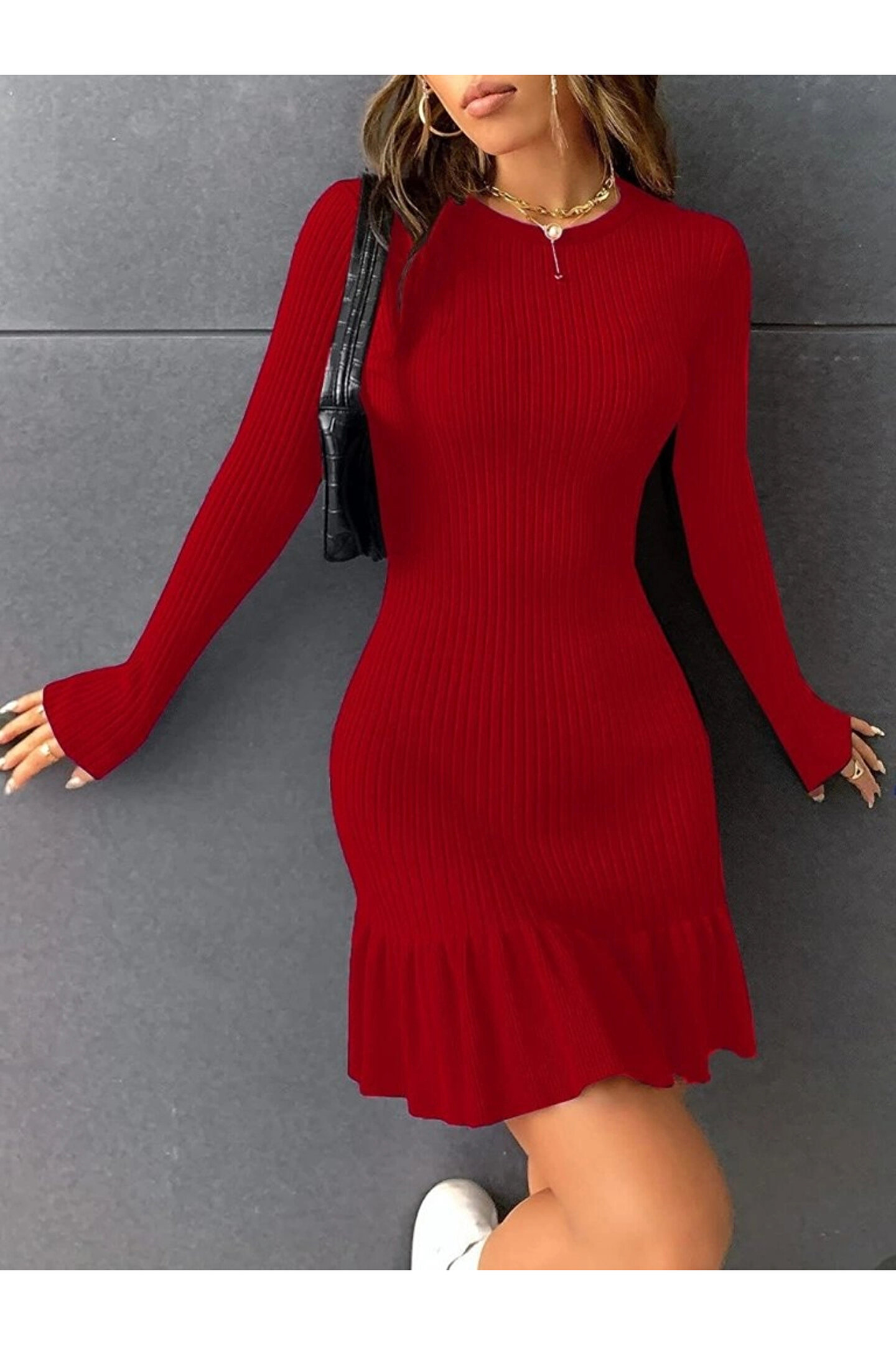 Kadın Bisiklet Yaka Uzun Kol Etek Ucu Fırfırlı Triko (polyenit) Mini Boy Elbise