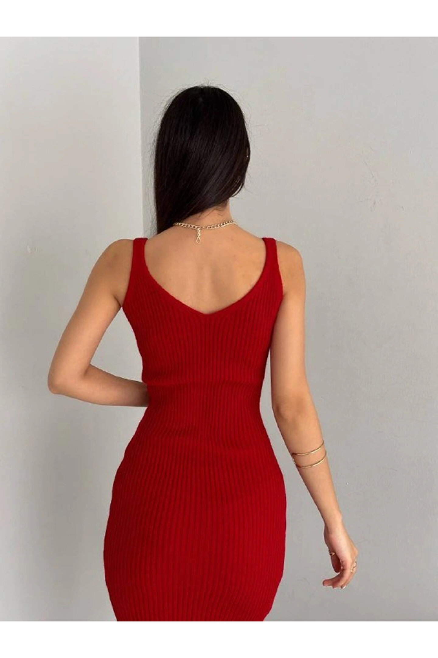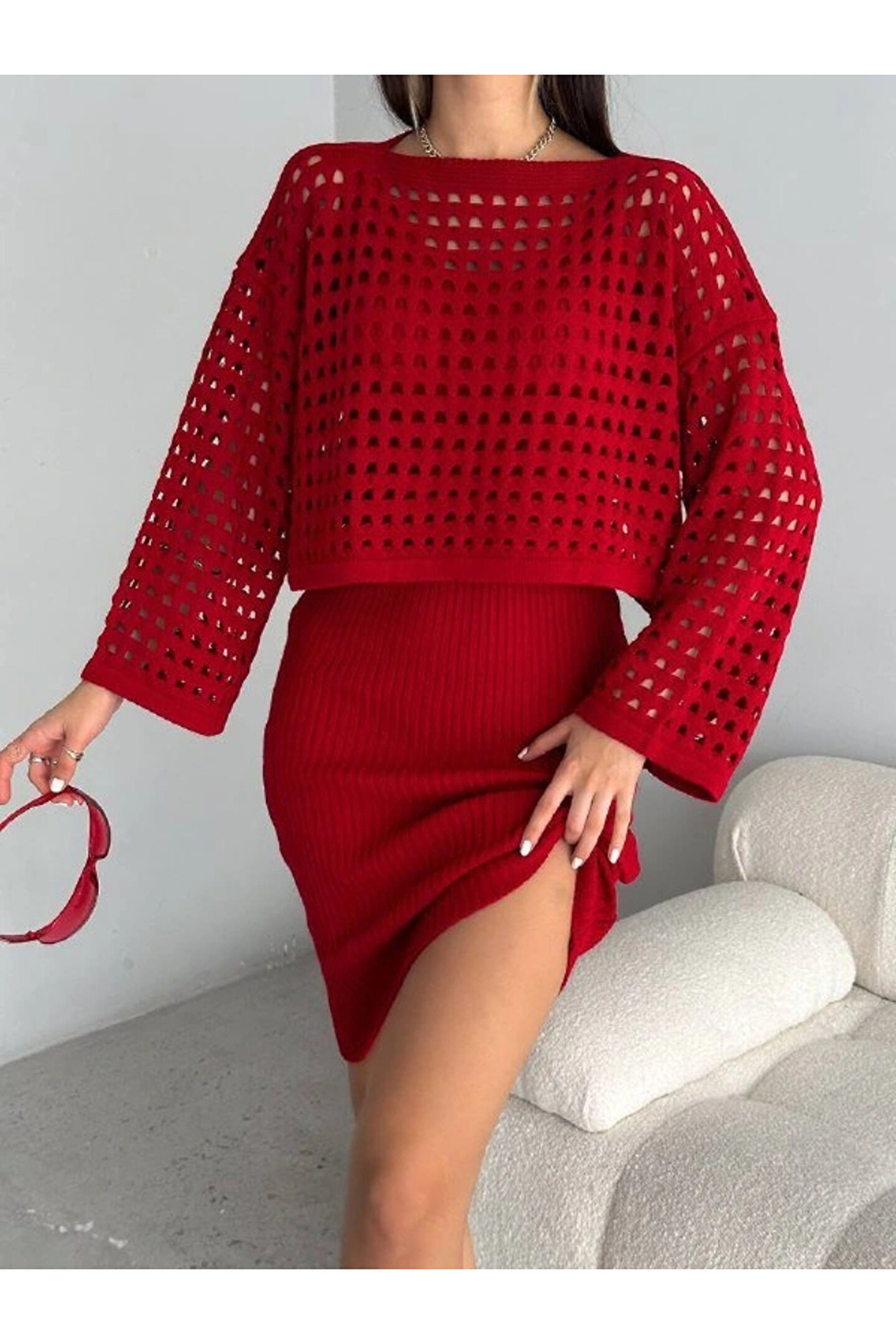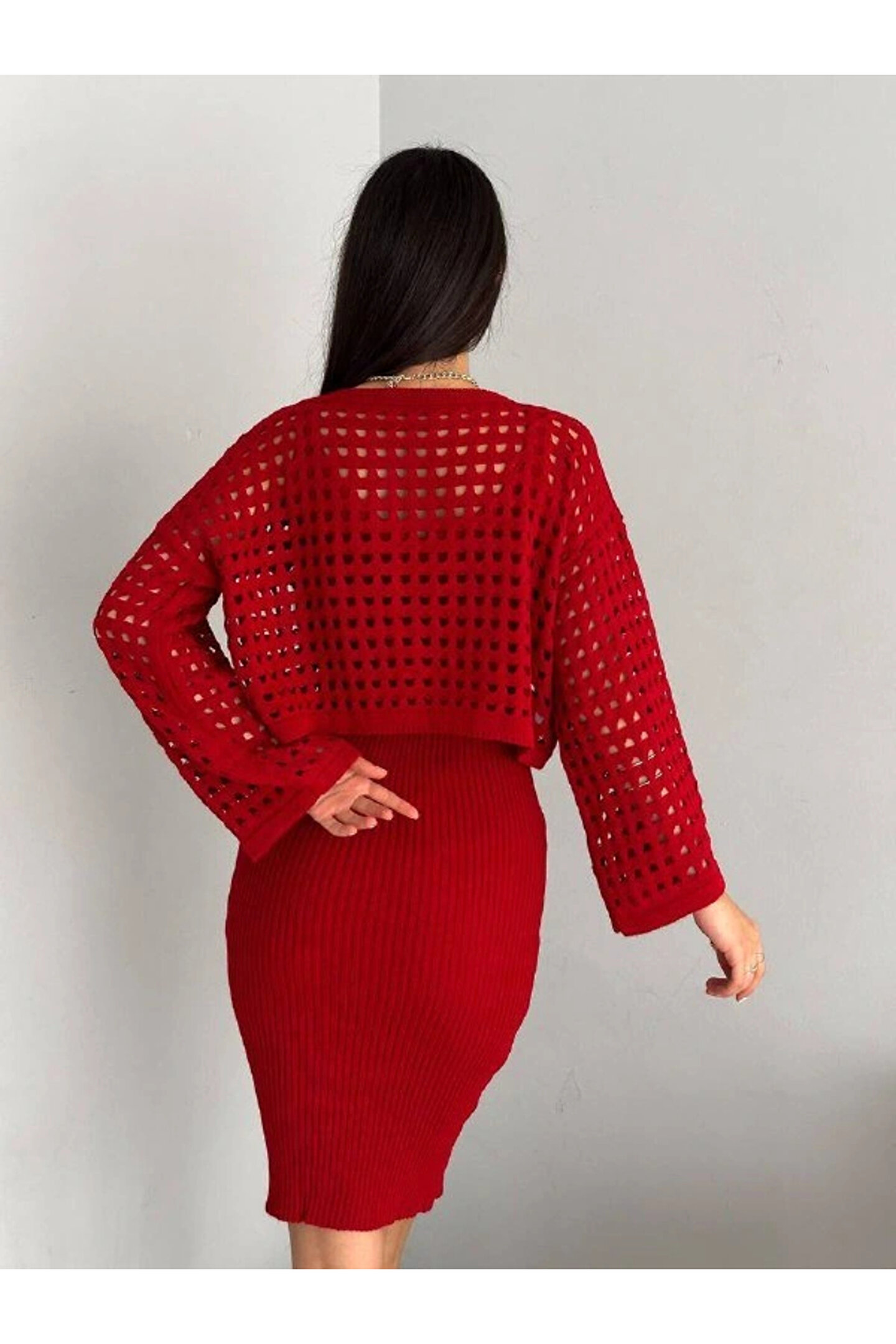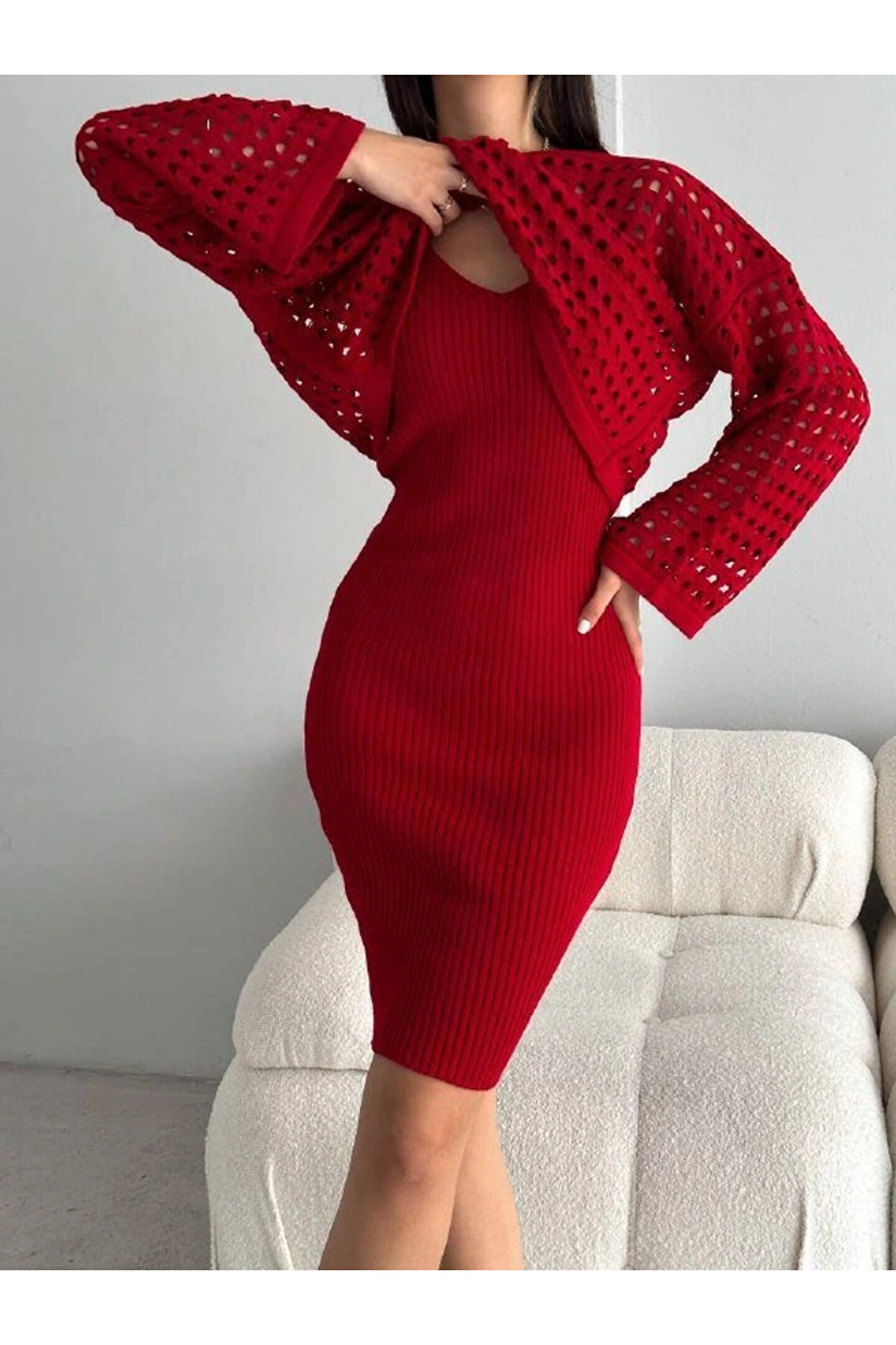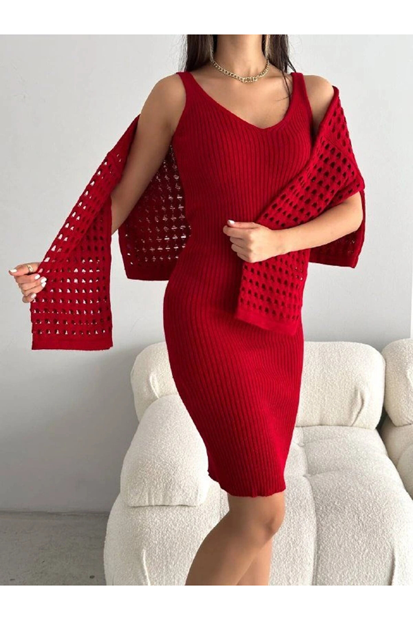 Kadın Delikli Kazak Askılı Elbise Triko Kumaş Ikili Takım
