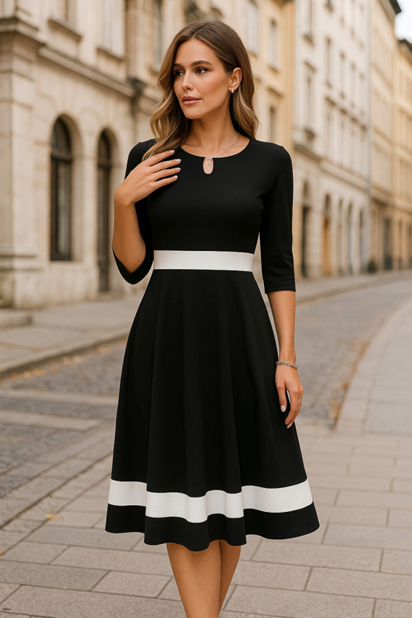 Kadın Fakir Kol Yakası Açık Blok Renkli Krep Midi Elbise