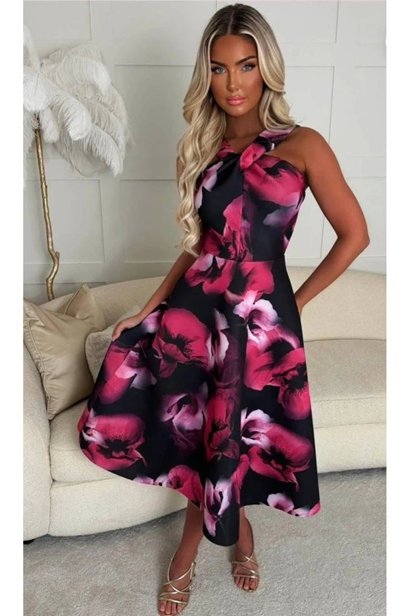 Silerra Kadın Halter Yaka Detay Ciçek Baskılı Midi Boy Elbise