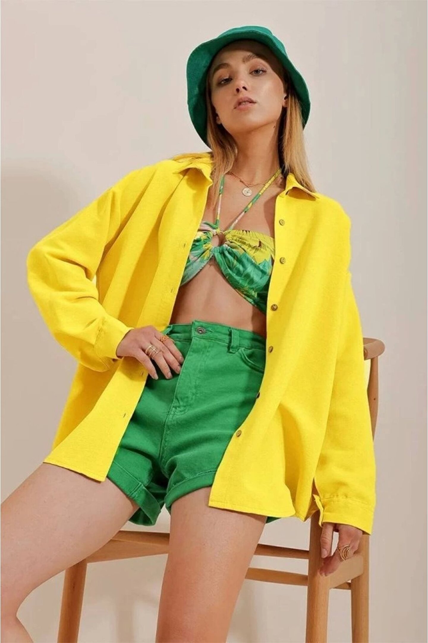 Gökyüzü Moda Düğmeli Ve Çizgi Detaylı Yeşil Gömlek