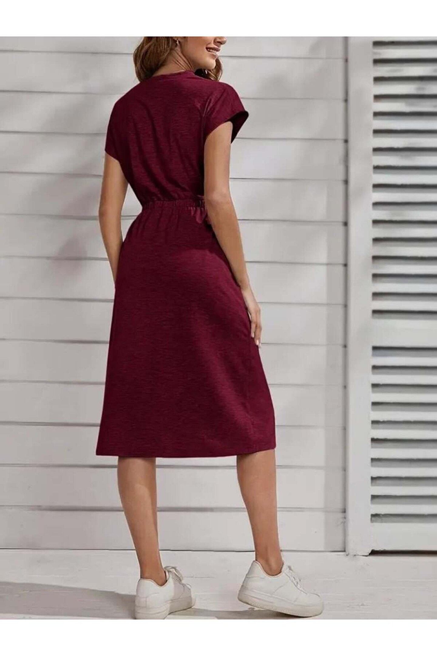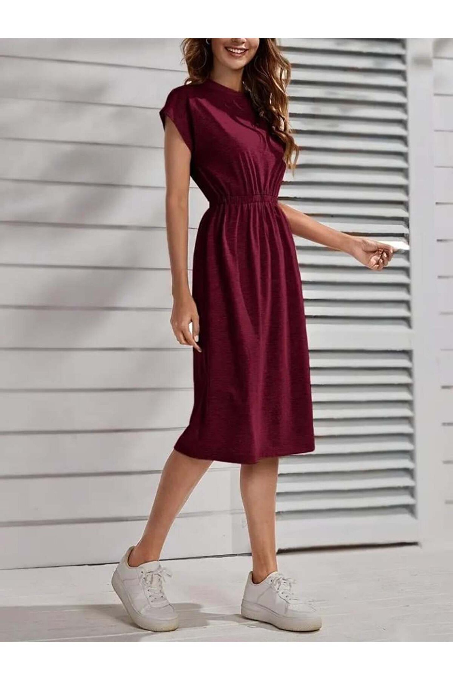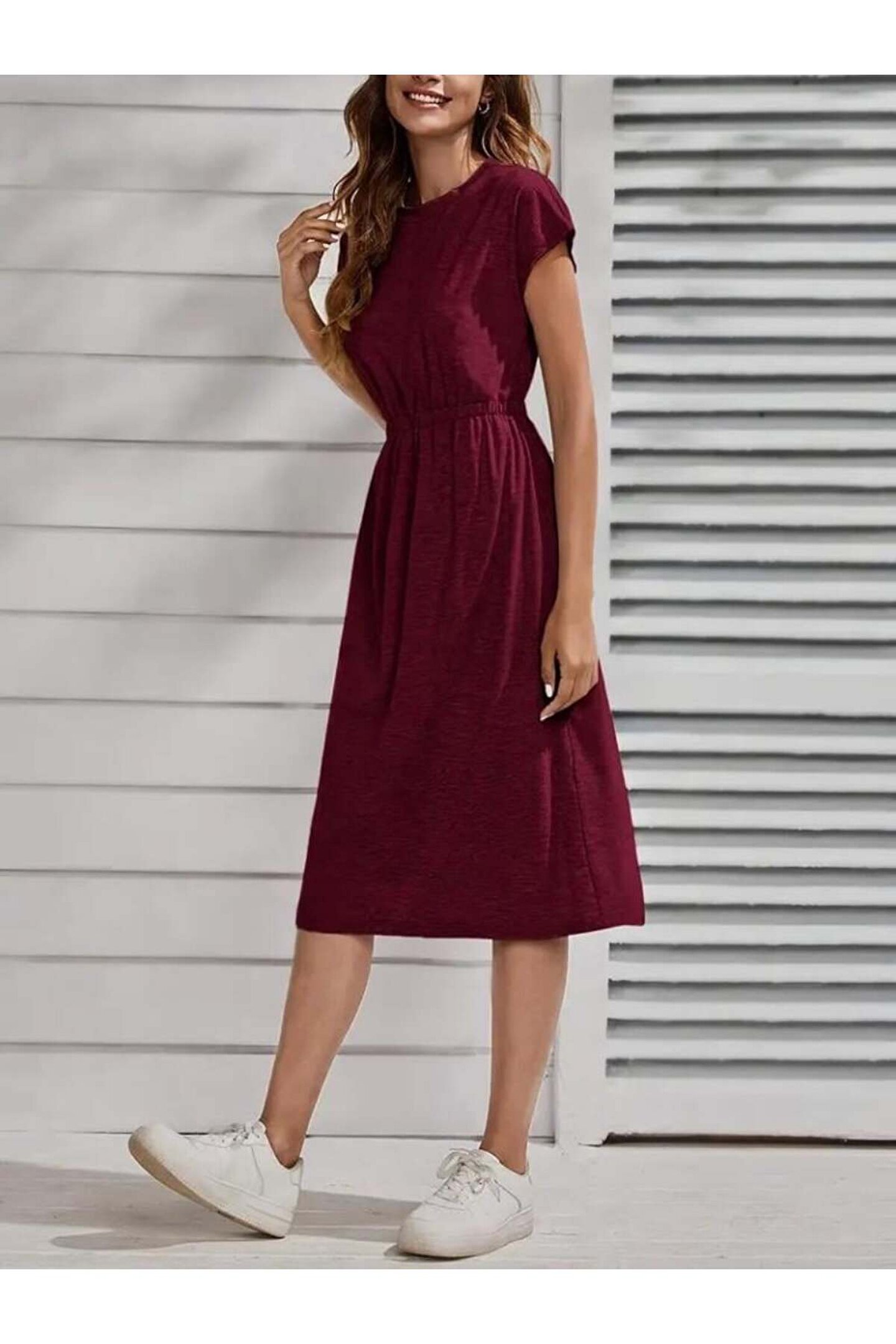 Kadın Kısa Kollu Bisiklet Yaka Belden Lastikli Midi Viskon Elbise