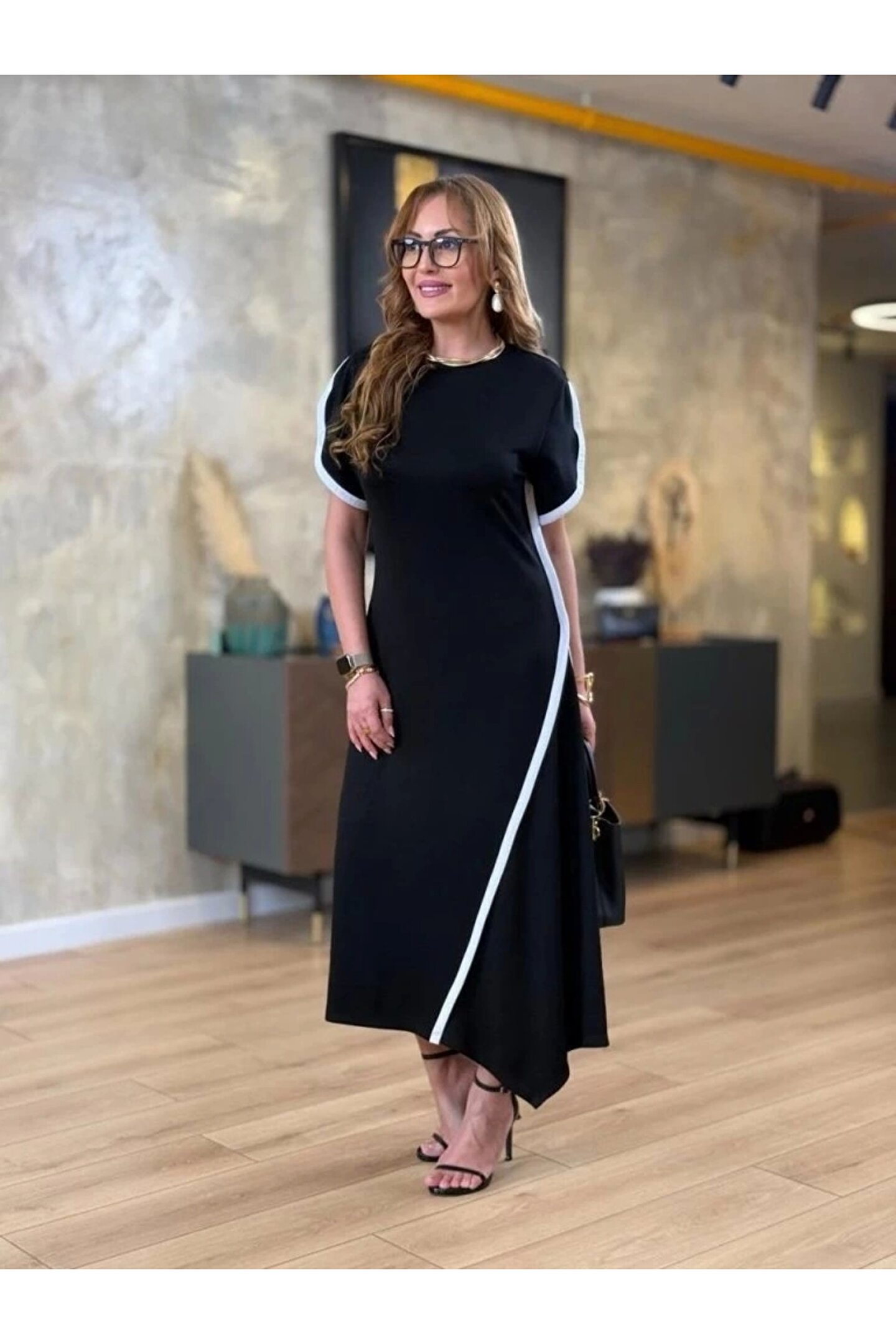 Silerra Kadın Kısa Kollu Bisiklet Yaka çift şerit Renk Detaylı Asimetrik Kesim Viskon Iki Iplik Elbise