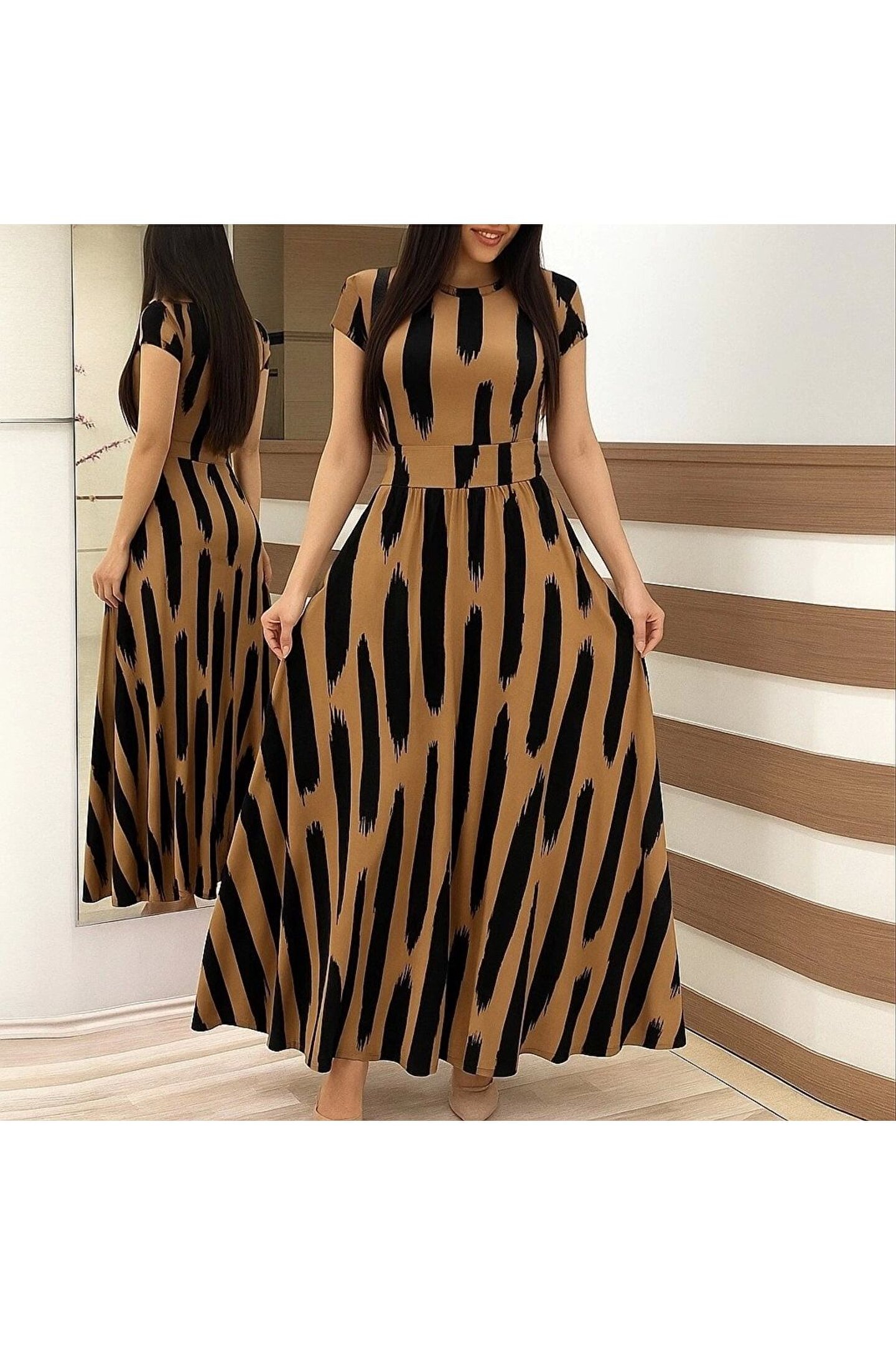 Kadın Kısa Kollu Bisiklet Yaka Puantiyeli Maksi örme Krep Elbise