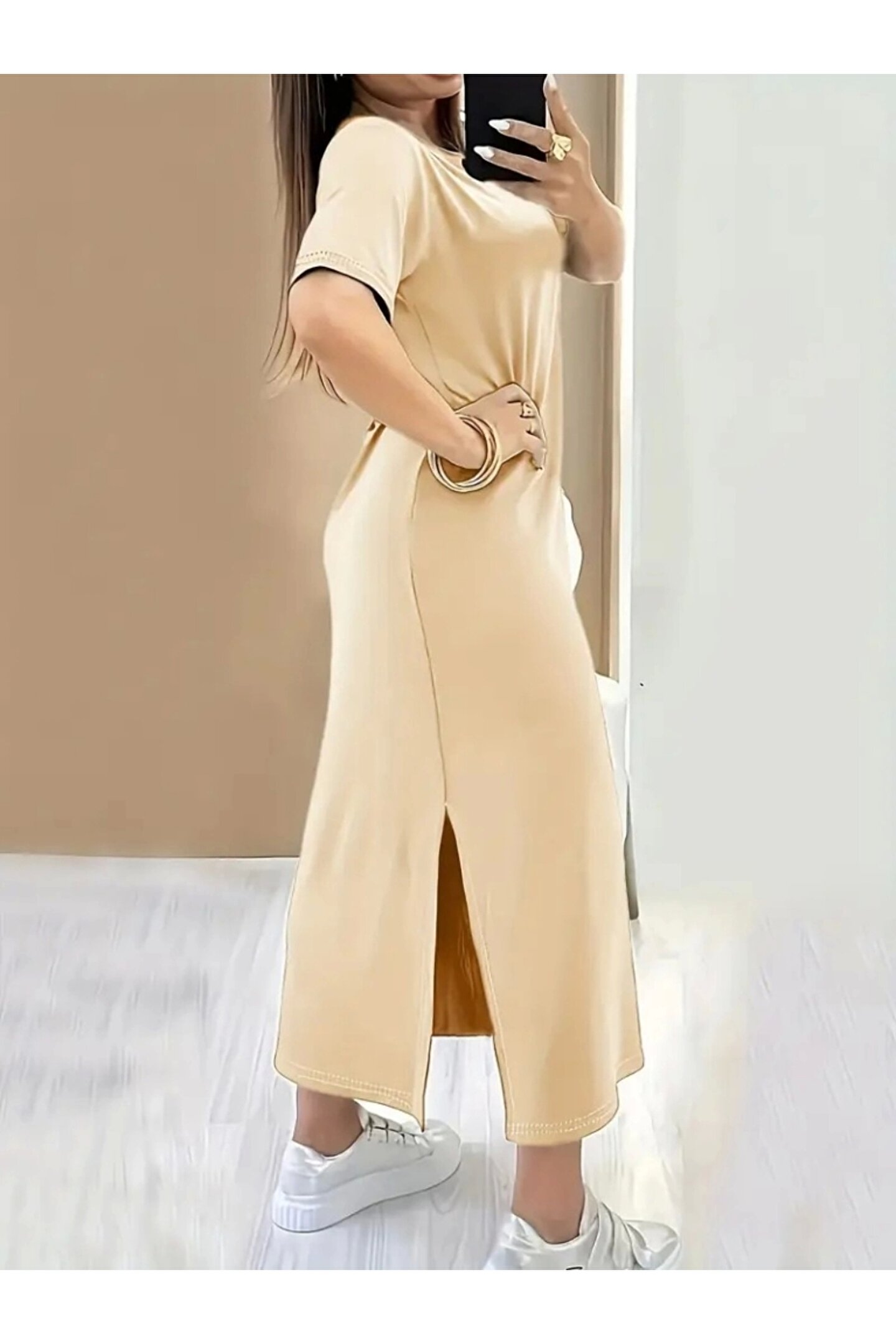 - Zarif tasarımıyla dikkat çeken bu kadın elbise, kırmızı gül figürleriyle süslenmiş kolye hediyesiyle kombinlenebilir.; - Rahat kesimi sayesinde gün boyu konfor sunan bu elbise, günlük kullanım için idealdir.; - Yandan yırtmaç detayları ile hareket özgürlüğü sağlayarak şık bir görünüm kazandırır.; - Sade ve düz deseniyle her türlü aksesuarla kolayca uyum sağlar; zamansız bir stil oluşturur.; - Kısa kollu bisiklet yakası, yaz aylarında serinlik ve rahatlık sunarken, modern bir dokunuş katmaktadır.; - Viskon kumaşı yumuşak dokusuyla cildinize nazikçe dokunurken dayanıklılığıyla uzun süreli kullanım vaat eder.; - Kemersiz tasarımı ile minimalist bir şıklık arayanların tercihi olacak şekilde dizayn edilmiştir.; - Cepsiz yapısı pratikliği ön planda tutarak minimalist tarza sahip olanlara hitap etmektedir.