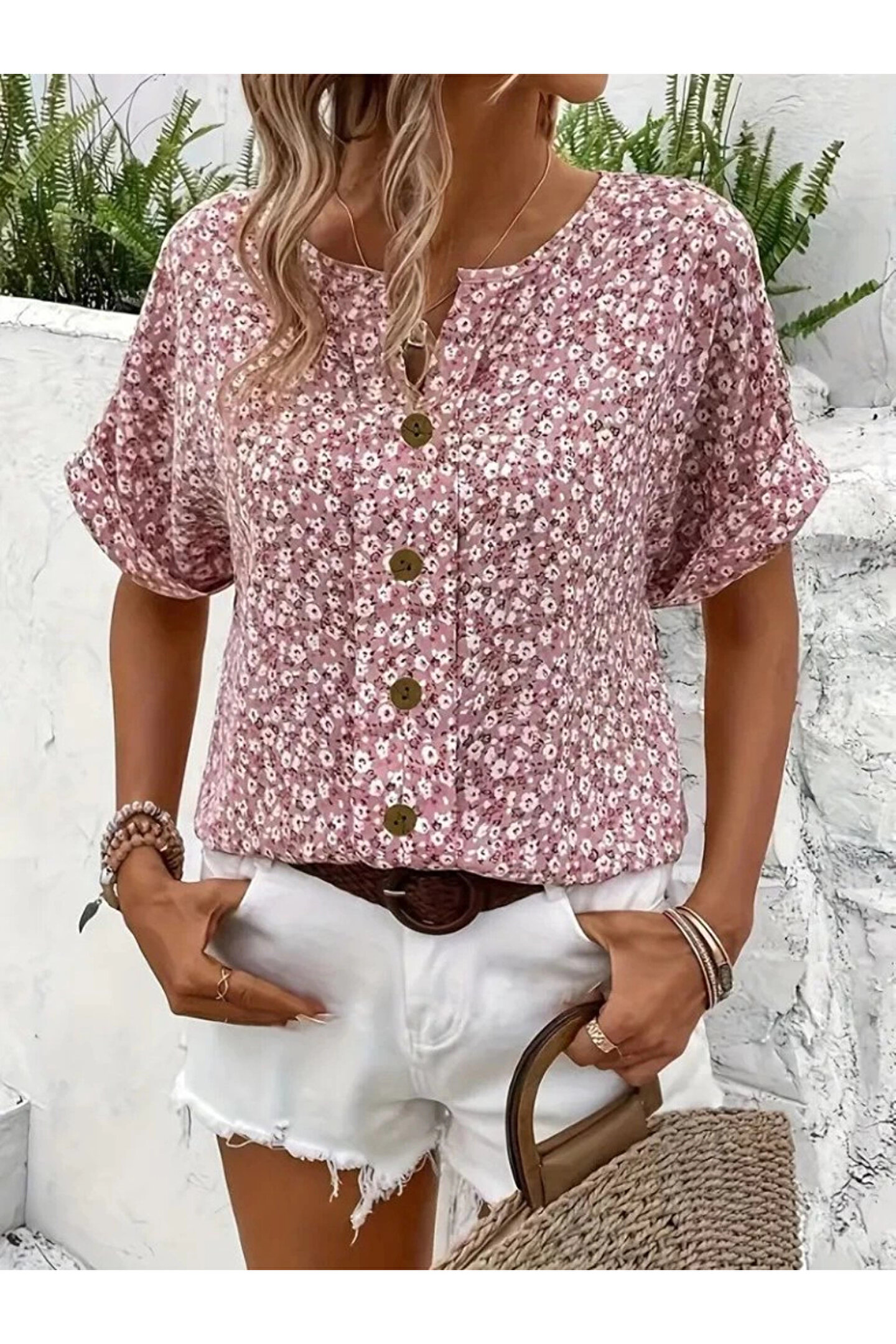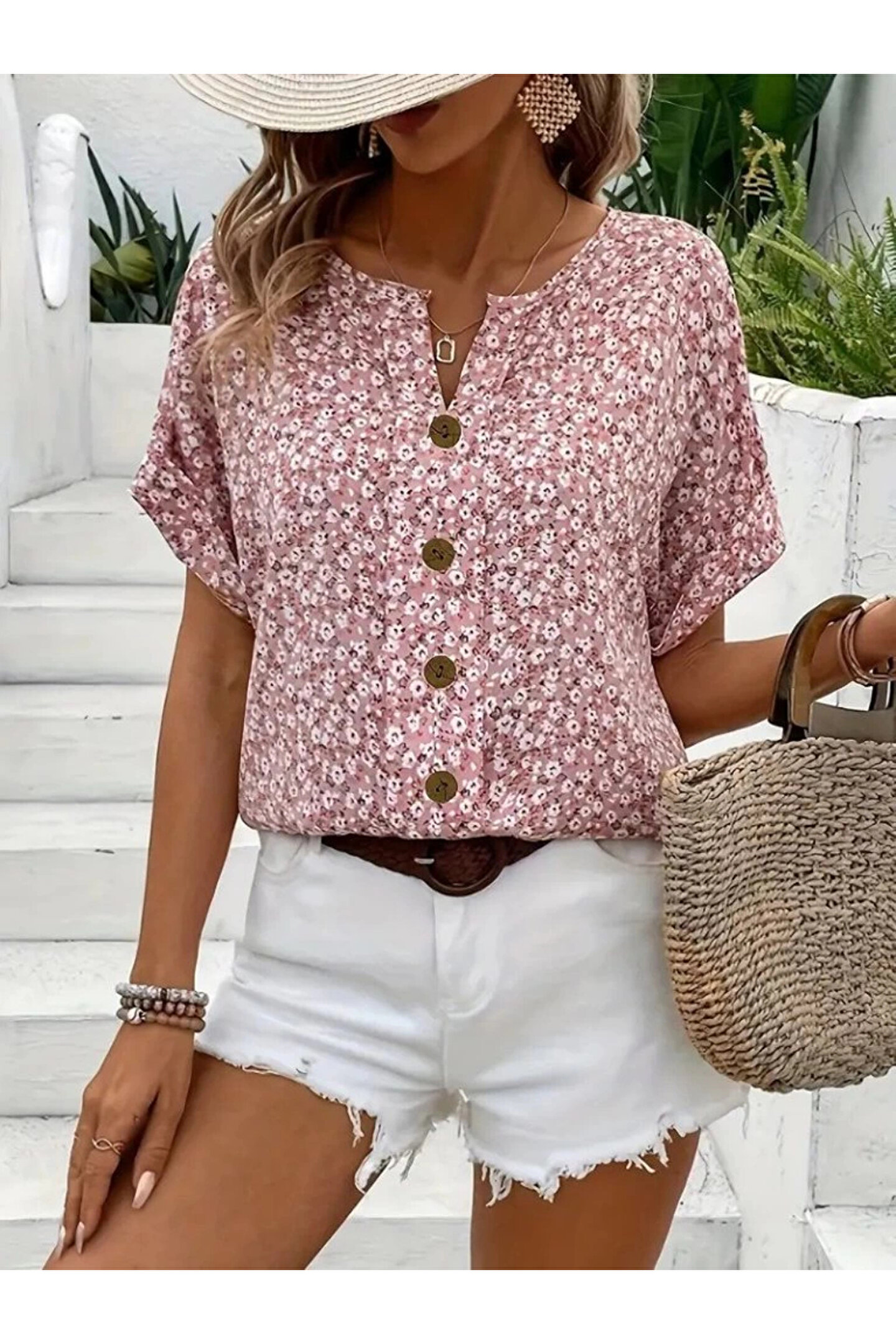 Kadın Kısa Kollu çentikli V Yaka Ve Düğme Detaylı çiçek Desenli Süprem Bluz Modelin Ölçüleri: Boy:165, Kg:55, Göğüs:90, Bel:72, Kalça: 100 Modelin üzerindeki ürün M/38 bedendir Trendleri belirleyen kadın giyim markası velmorafashion'a hoşgeldiniz! VelmoraFashion, kadınların tarzlarını ifade etmelerine ve güçlü bir duruş sergilemelerine olanak tanıyan bir markadır.; 2018 yılından bu yana sektörde varlığını sürdüren firmamız, yenilikçi tasarımları ve kaliteli ürünleriyle dikkat çekiyor.; VelmoraFashion olarak amacımız, her kadının kendine özgü tarzını yansıtabileceği, güvenilir ve şık giyim seçenekleri sunmaktır.; Koleksiyonlarımızda her zevke hitap eden parçaları bulabilirsiniz.; Günlük hayatta rahatlıkla tercih edilebilecek şık elbiselerden iş görüşmelerinde stilinizi tamamlayacak takım elbiselere, spor giyimden abiye modellere kadar geniş bir ürün yelpazemiz bulunmaktadır.; Tasarımlarımızı oluştururken moda trendlerini yakından takip ediyor, farklı tarzlara ve bedenlere uygun seçenekler sunmaya özen gösteriyoruz.; Aynı zamanda kalite ve dayanıklılık da önceliklerimiz arasındadır.; Her parça, titizlikle seçilen kumaşlar ve dikkatle işlenen detaylarla özenle üretilmektedir.; Müşteri memnuniyeti bizim için en önemli önceliktir.; Profesyonel müşteri hizmetleri ekibimiz, her adımda size yardımcı olmak ve alışveriş deneyiminizi en üst düzeye çıkarmak için buradadır.; Siz değerli müşterilerimizin geri bildirimleri, bizi daha da ileriye taşımak için önemli bir kaynaktır.; Velmora Fashion olarak, sadece giyimde değil, aynı zamanda kadınların güçlendirilmesi ve kendilerini ifade etmeleri konusunda da bir misyon taşıyoruz.; Her kadının kendi tarzını keşfetmesine ve kendine güvenle adım atmasına yardımcı olmak için buradayız.; VELMORAFAShion'da her detayı düşünülmüş, şıklığı ve rahatlığı bir arada sunan parçalarla dolu koleksiyonlarımızı keşfetmek için sizi mağazamıza bekliyoruz.; Siz de ailemize katılın ve tarzınızı keşfedin!