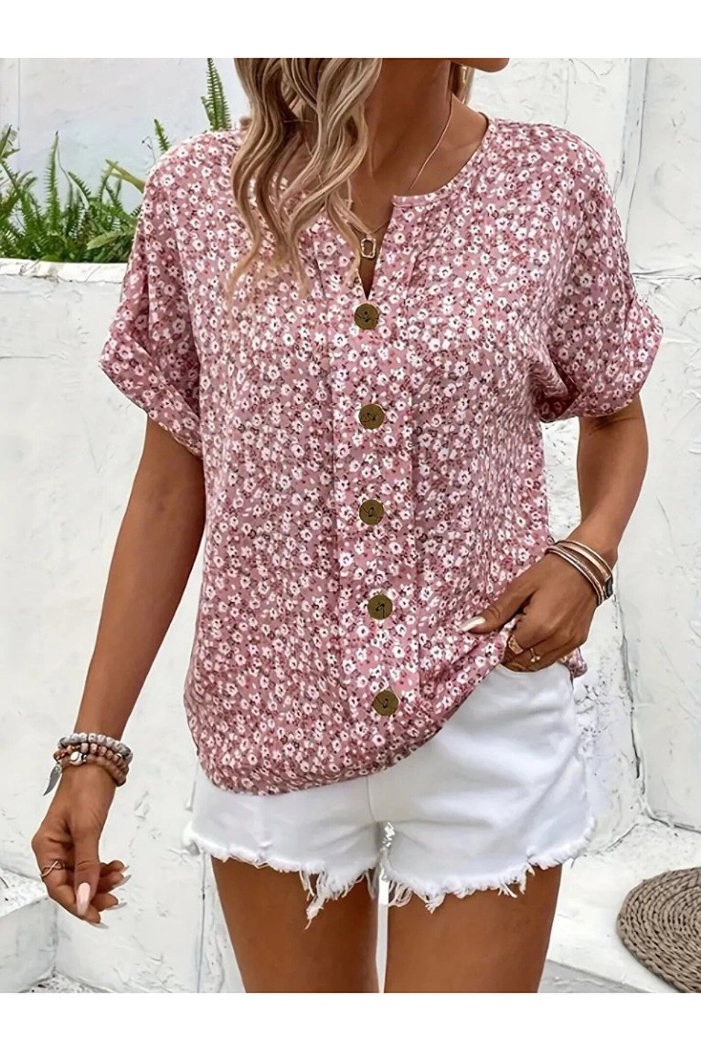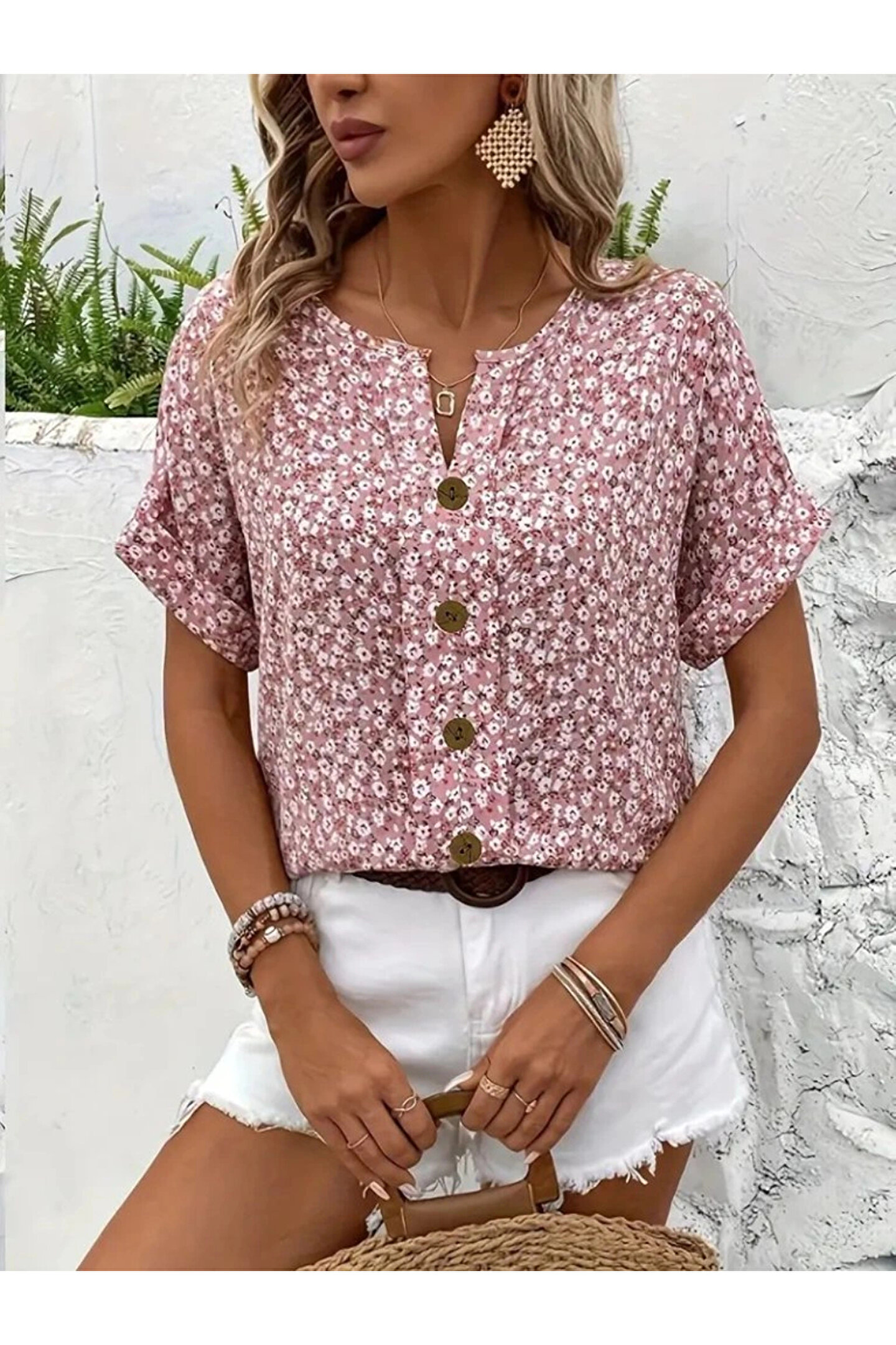 Kadın Kısa Kollu çentikli V Yaka Ve Düğme Detaylı çiçek Desenli Süprem Bluz Modelin Ölçüleri: Boy:165, Kg:55, Göğüs:90, Bel:72, Kalça: 100 Modelin üzerindeki ürün M/38 bedendir Trendleri belirleyen kadın giyim markası velmorafashion'a hoşgeldiniz! VelmoraFashion, kadınların tarzlarını ifade etmelerine ve güçlü bir duruş sergilemelerine olanak tanıyan bir markadır.; 2018 yılından bu yana sektörde varlığını sürdüren firmamız, yenilikçi tasarımları ve kaliteli ürünleriyle dikkat çekiyor.; VelmoraFashion olarak amacımız, her kadının kendine özgü tarzını yansıtabileceği, güvenilir ve şık giyim seçenekleri sunmaktır.; Koleksiyonlarımızda her zevke hitap eden parçaları bulabilirsiniz.; Günlük hayatta rahatlıkla tercih edilebilecek şık elbiselerden iş görüşmelerinde stilinizi tamamlayacak takım elbiselere, spor giyimden abiye modellere kadar geniş bir ürün yelpazemiz bulunmaktadır.; Tasarımlarımızı oluştururken moda trendlerini yakından takip ediyor, farklı tarzlara ve bedenlere uygun seçenekler sunmaya özen gösteriyoruz.; Aynı zamanda kalite ve dayanıklılık da önceliklerimiz arasındadır.; Her parça, titizlikle seçilen kumaşlar ve dikkatle işlenen detaylarla özenle üretilmektedir.; Müşteri memnuniyeti bizim için en önemli önceliktir.; Profesyonel müşteri hizmetleri ekibimiz, her adımda size yardımcı olmak ve alışveriş deneyiminizi en üst düzeye çıkarmak için buradadır.; Siz değerli müşterilerimizin geri bildirimleri, bizi daha da ileriye taşımak için önemli bir kaynaktır.; Velmora Fashion olarak, sadece giyimde değil, aynı zamanda kadınların güçlendirilmesi ve kendilerini ifade etmeleri konusunda da bir misyon taşıyoruz.; Her kadının kendi tarzını keşfetmesine ve kendine güvenle adım atmasına yardımcı olmak için buradayız.; VELMORAFAShion'da her detayı düşünülmüş, şıklığı ve rahatlığı bir arada sunan parçalarla dolu koleksiyonlarımızı keşfetmek için sizi mağazamıza bekliyoruz.; Siz de ailemize katılın ve tarzınızı keşfedin!