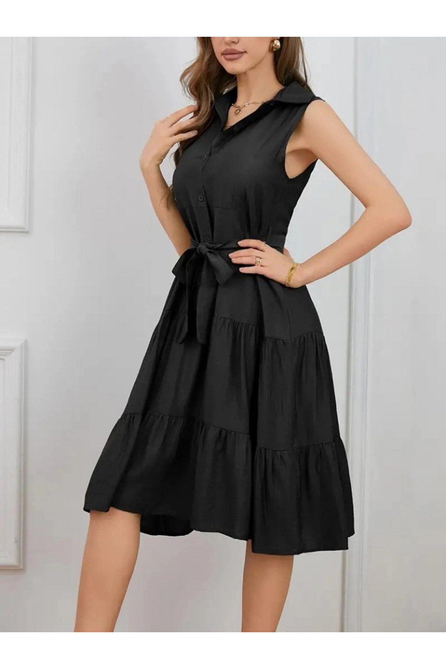 Kadın Kısa Kollu Gömlek Yaka Düğmeli Beli Kuşaklı Katlı Dokuma Midi Elbise