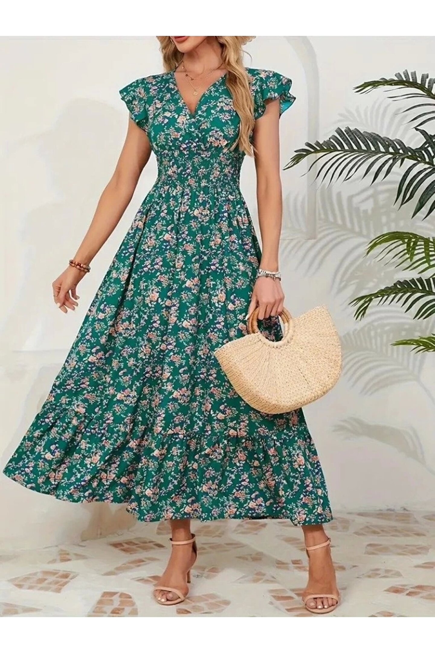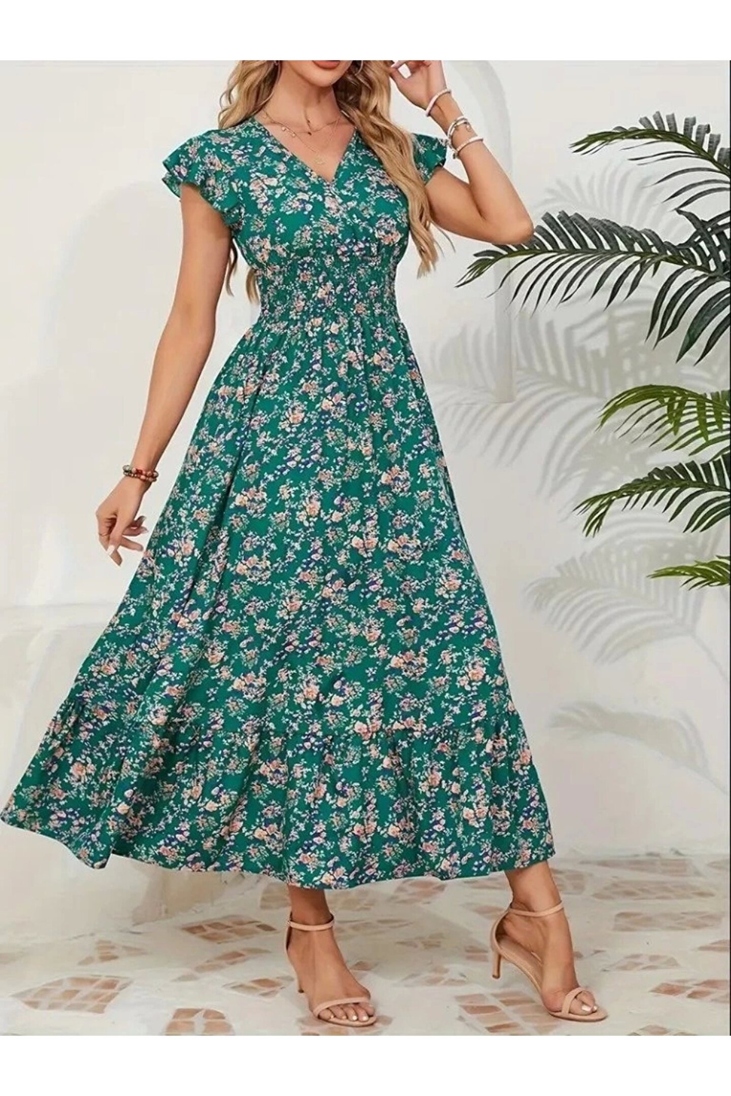 Silerra Kadın Kısa Kollu Kruvaze Yaka Beli Lastikli çiçek Desenli Elbise