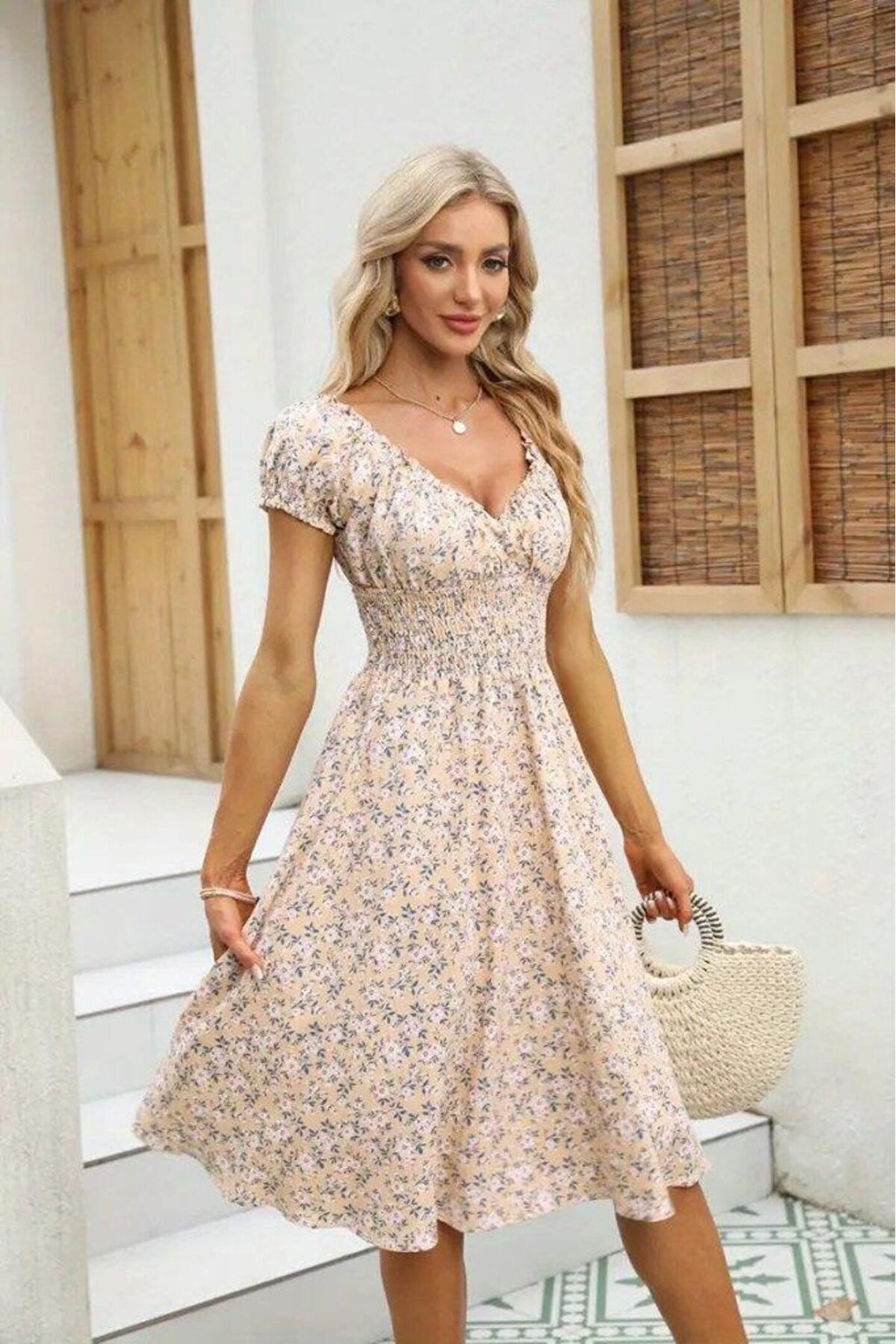 Kadın Kısa Kollu Kruvaze Yaka Lastikli Belden Gipeli çiçek Desenli Suprem Elbise