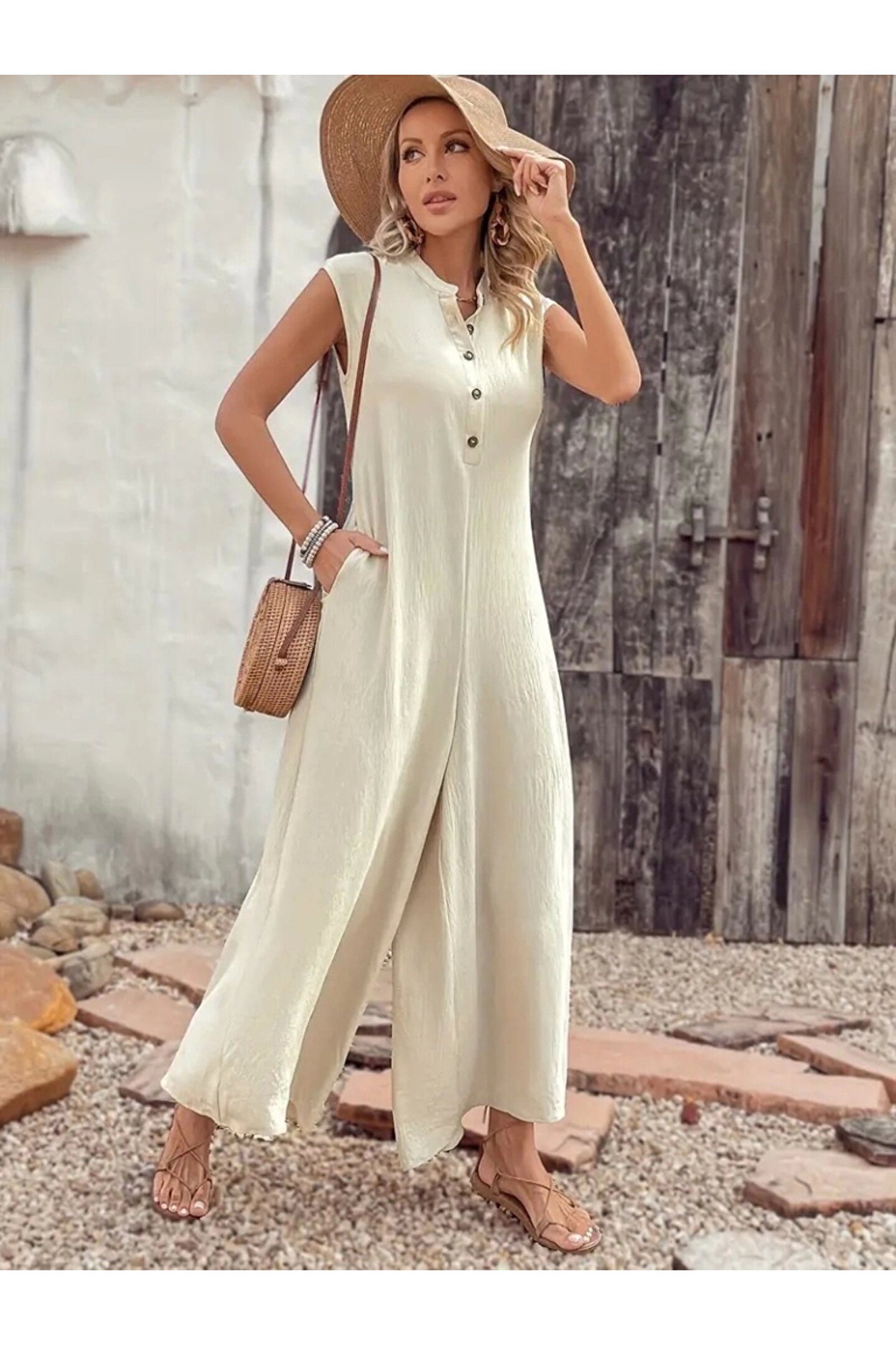 Kadın Kısa Kollu önden Düğmeli Paçaya Doğru Geniş Cepli Uzun Bürümcük Tulum