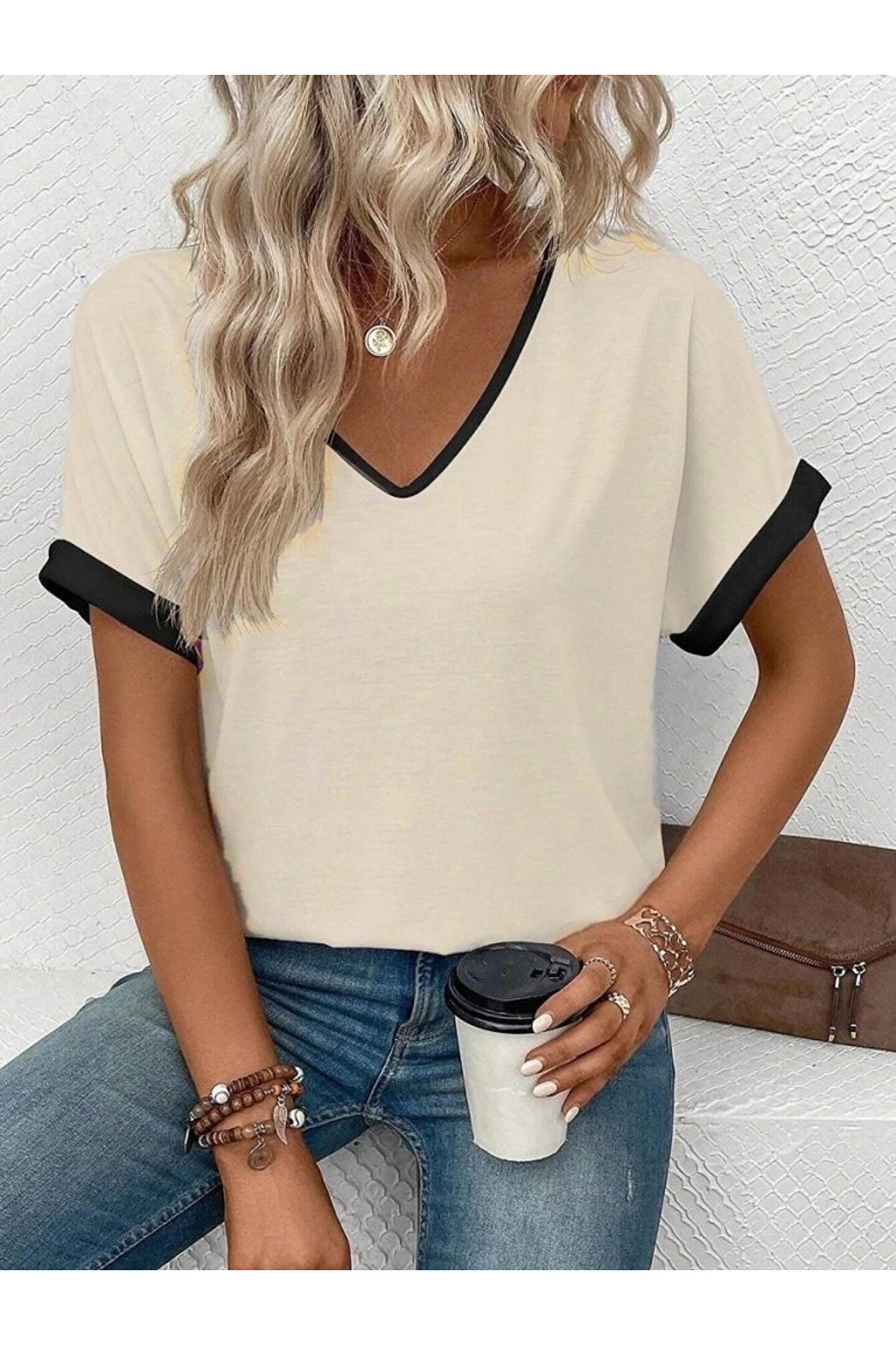 Kadın Kısa Kollu V Yakalı çift Renkli Viskon Bluz