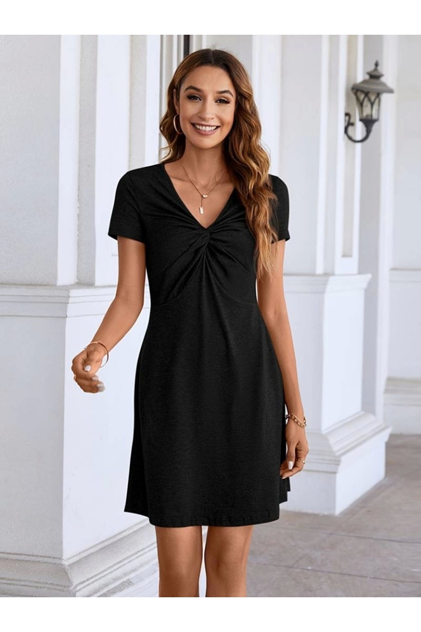 <p>Kadın Kısa Kollu Yaka Detay Viskon Elbise</p> <br> <p>Modelin Ölçüleri: Boy:165, Kg:55, Göğüs:90, Bel:72, Kalça: 100</p> <br> <p>Modelin üzerindeki ürün M/38 bedendir</p> <br> <ul> <li>TARZ-Diğerleri</li> <li>YAKA-Diğerleri</li> <li>DESEN-Diğerleri</li> <li>KOL UZUNLUK-Kısa Kol</li> <li>EK OZELLIKLER-Boş/Ek özellik Yok</li> <li>UZUNLUK-Diğerleri</li> <li>KALIP-Diger</li> <li>TARZ-Diger</li> <li>KAPATMA TURU-Diger</li> </ul>