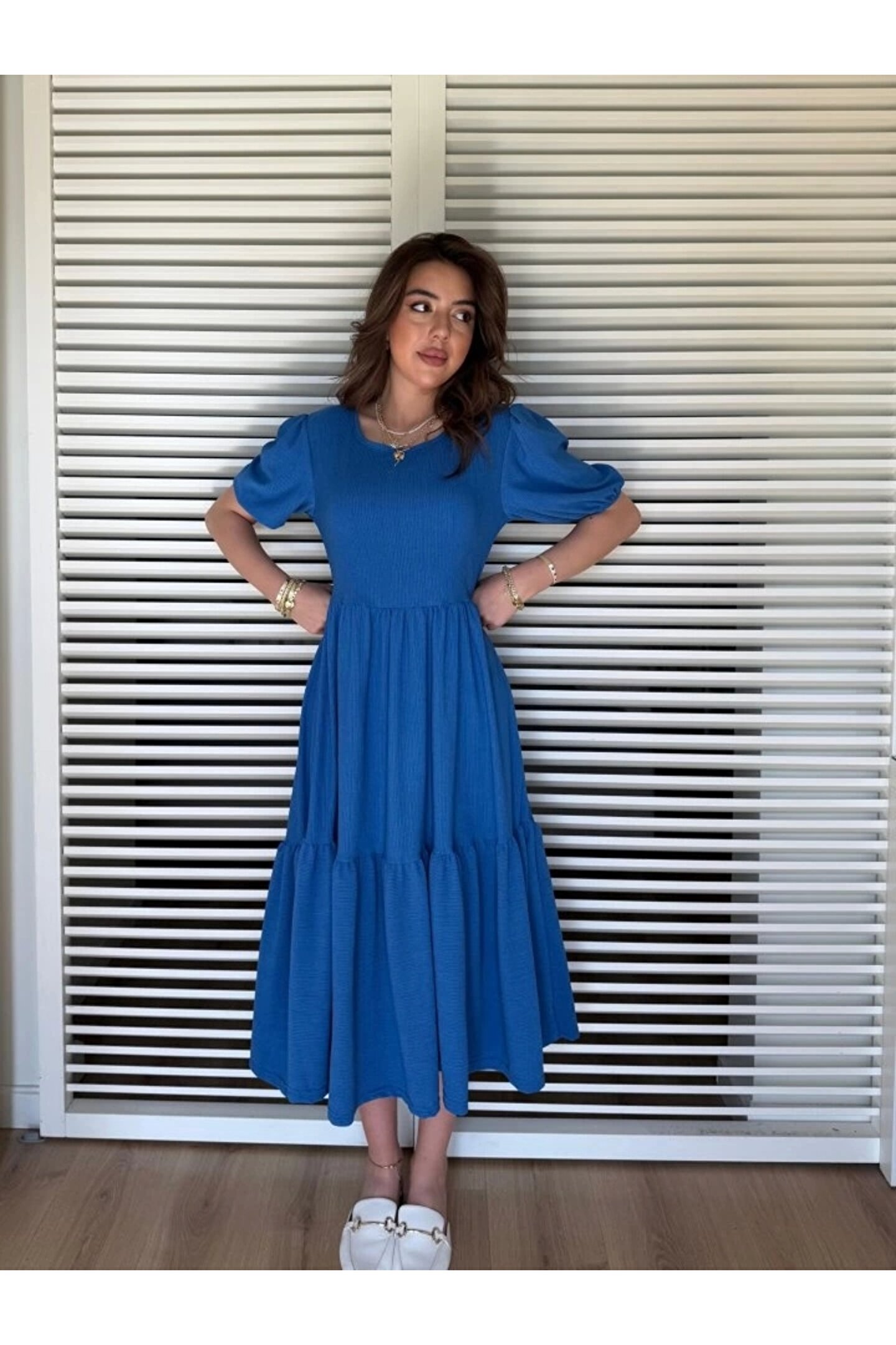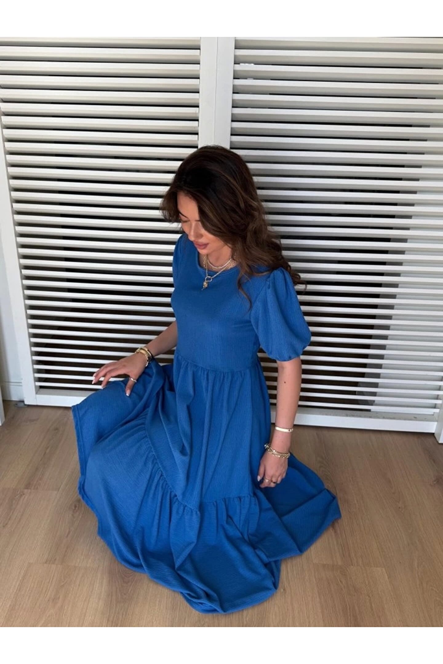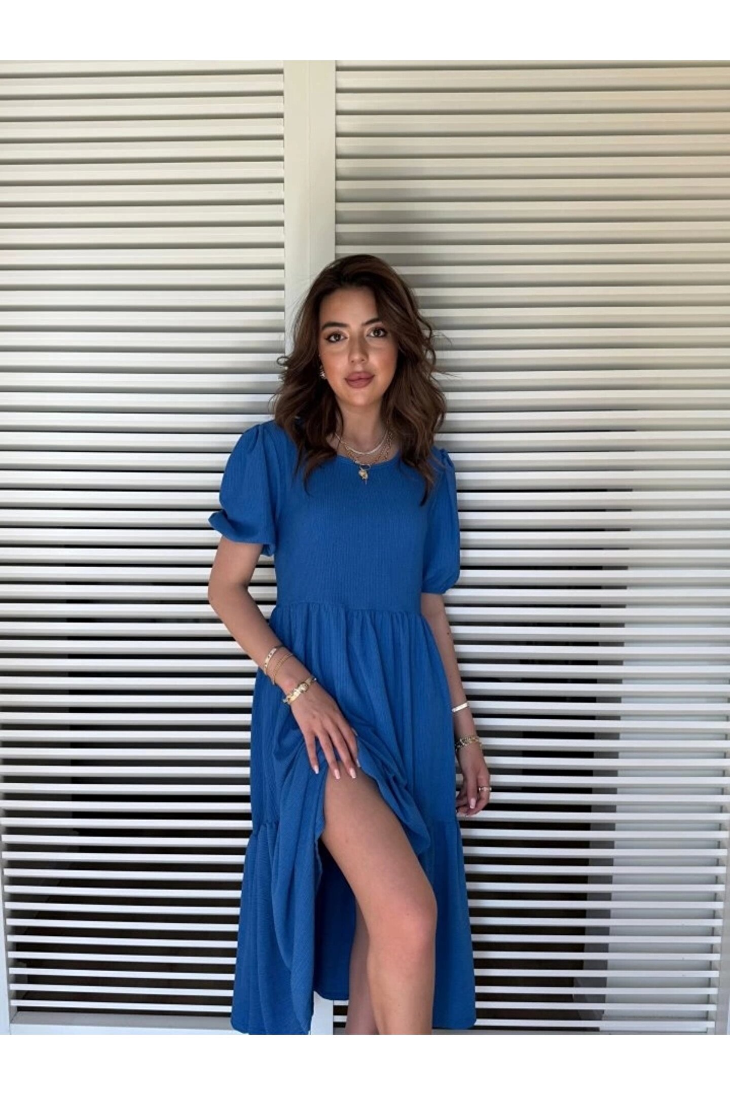 Kadın Kısa Kollu Yakası Açık Katlı Bürümcük Balon Elbise