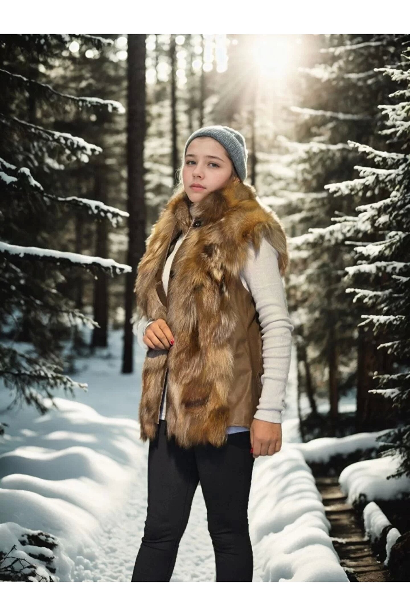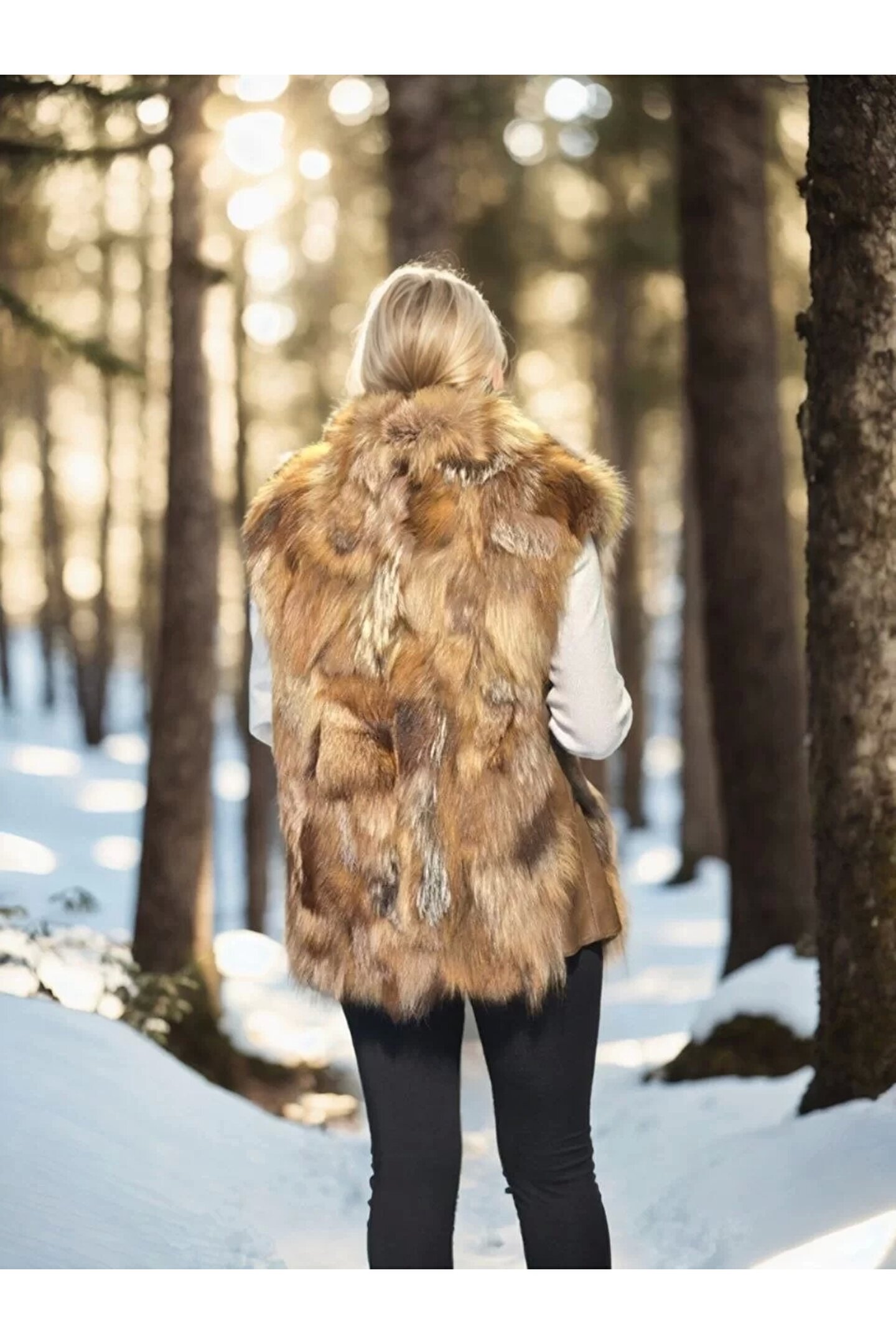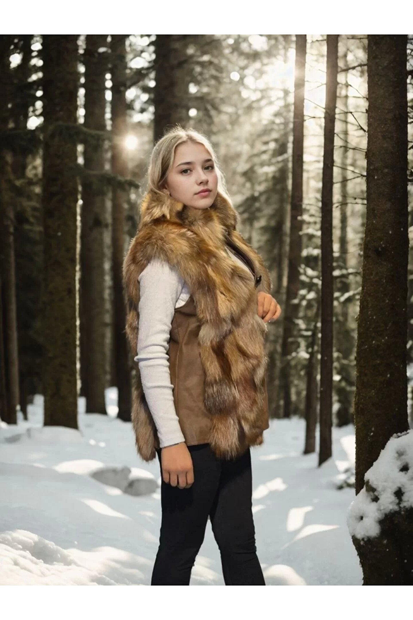 Kadın Kolsuz Hakiki Deri Kürk - Kahve