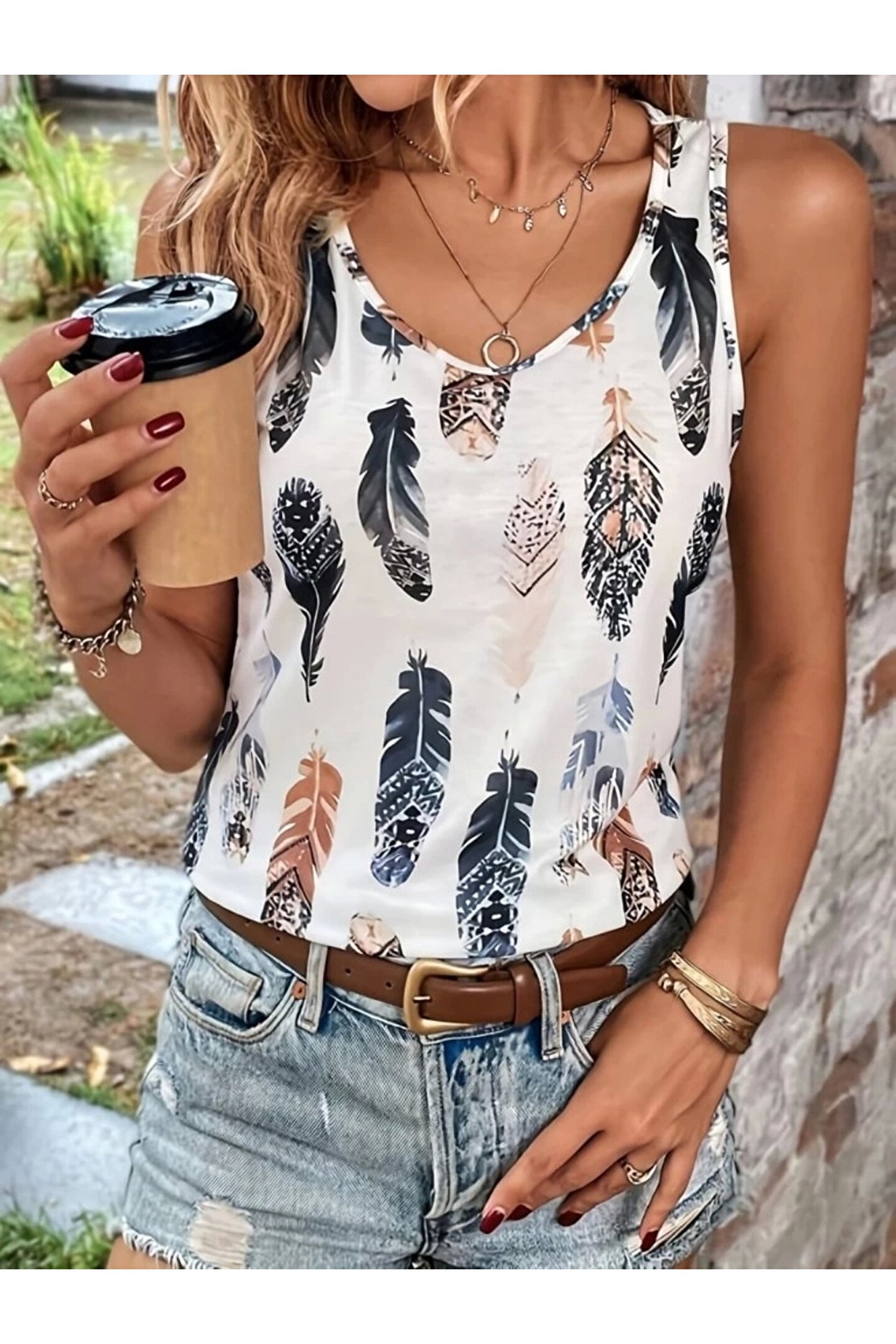 Kadın Sıfır Kollu V Yakalı Yaprak Desenli Süprem Bluz