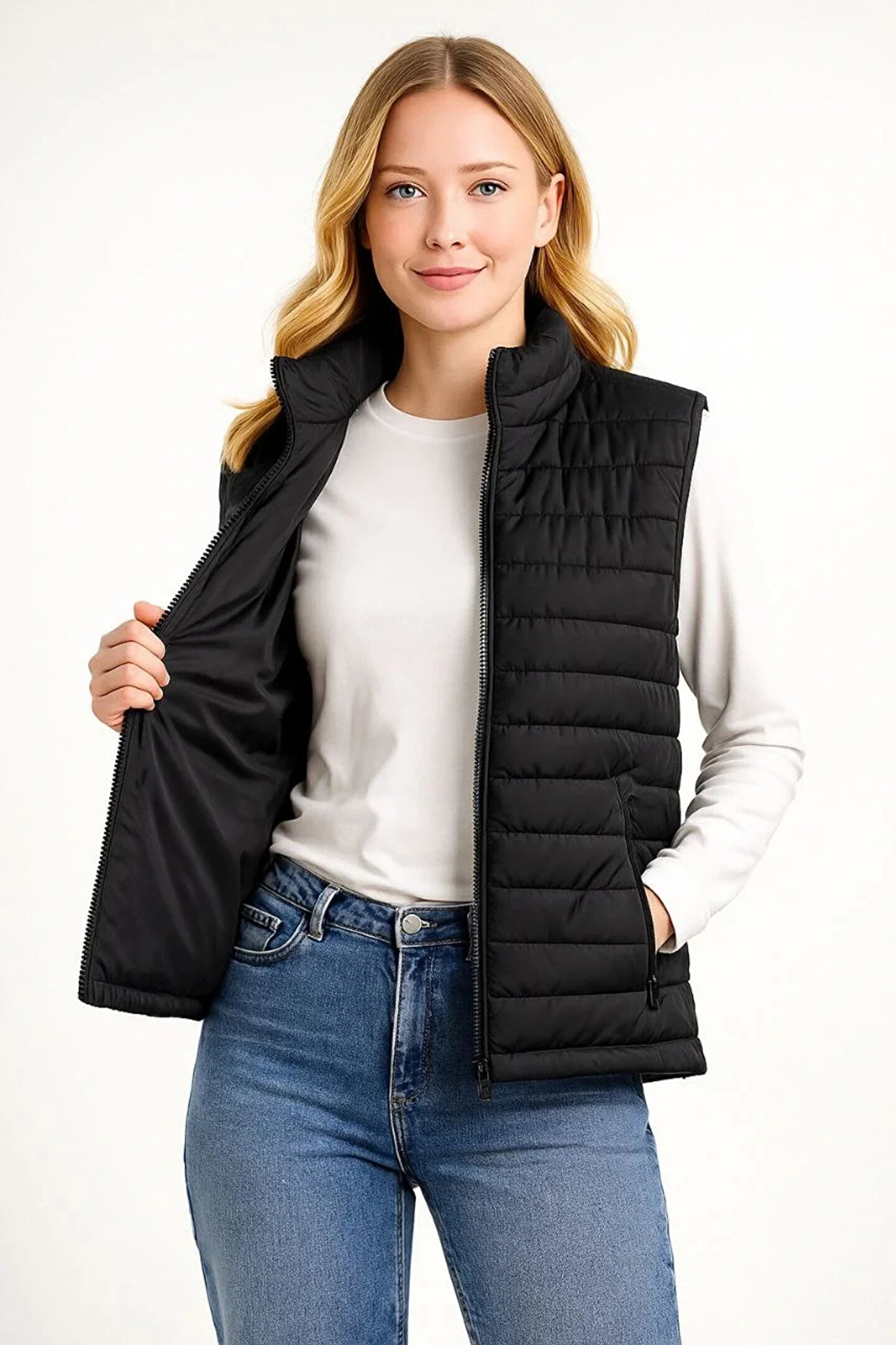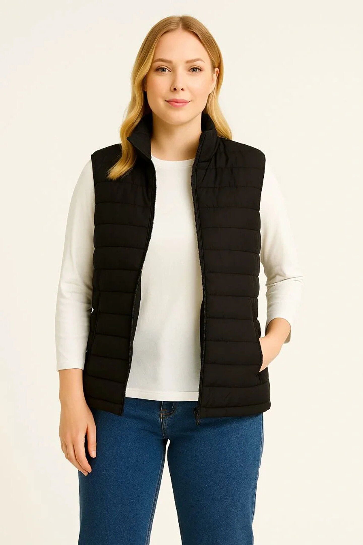 Şişme Fermuarlı Yelek Su Itici Kapitone Astarlı Kumaş Cepli Hafif Kışlık Spor Rahat Kalıp - Siyah