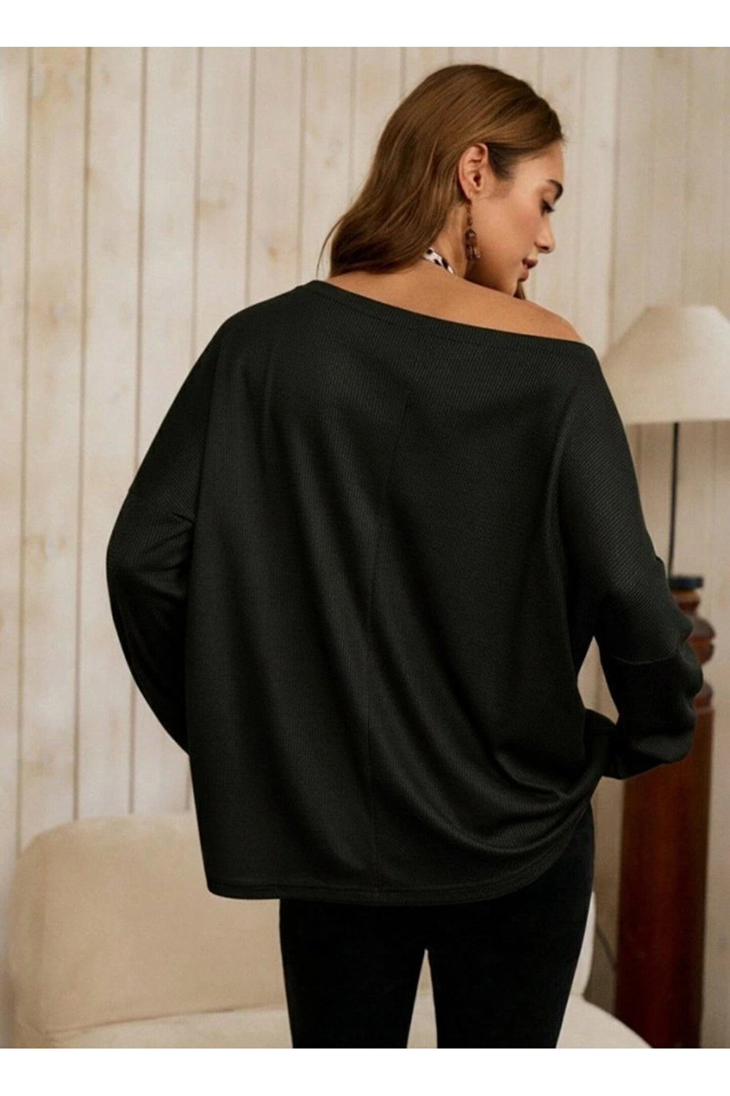 Kadın Tek Omuzdan Açık Yarasa Kollu Waffle Bluz