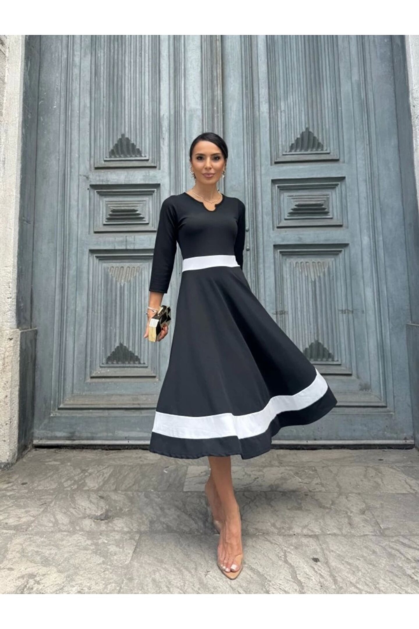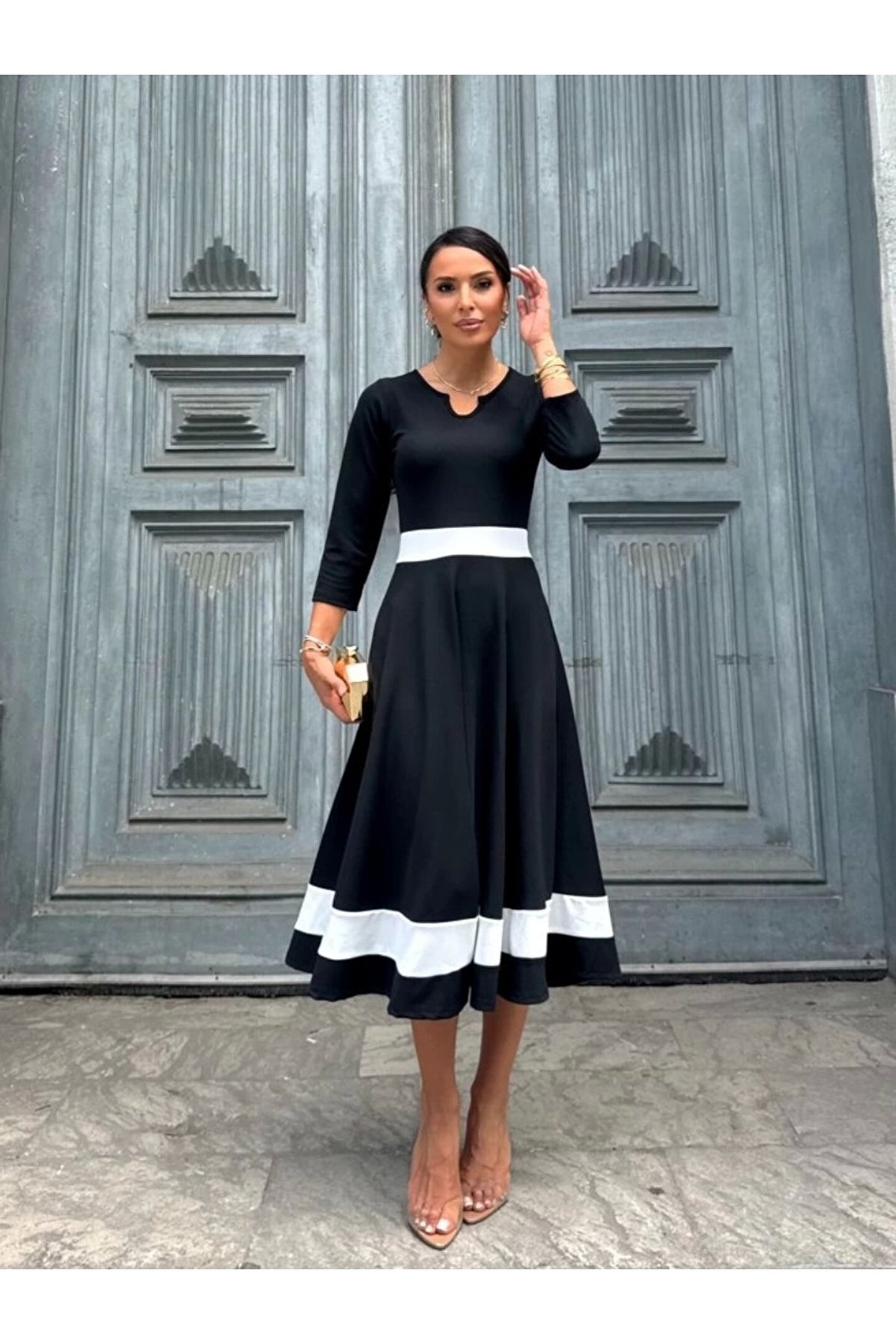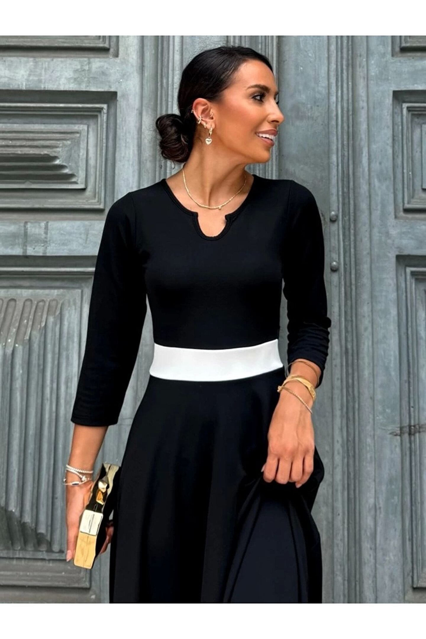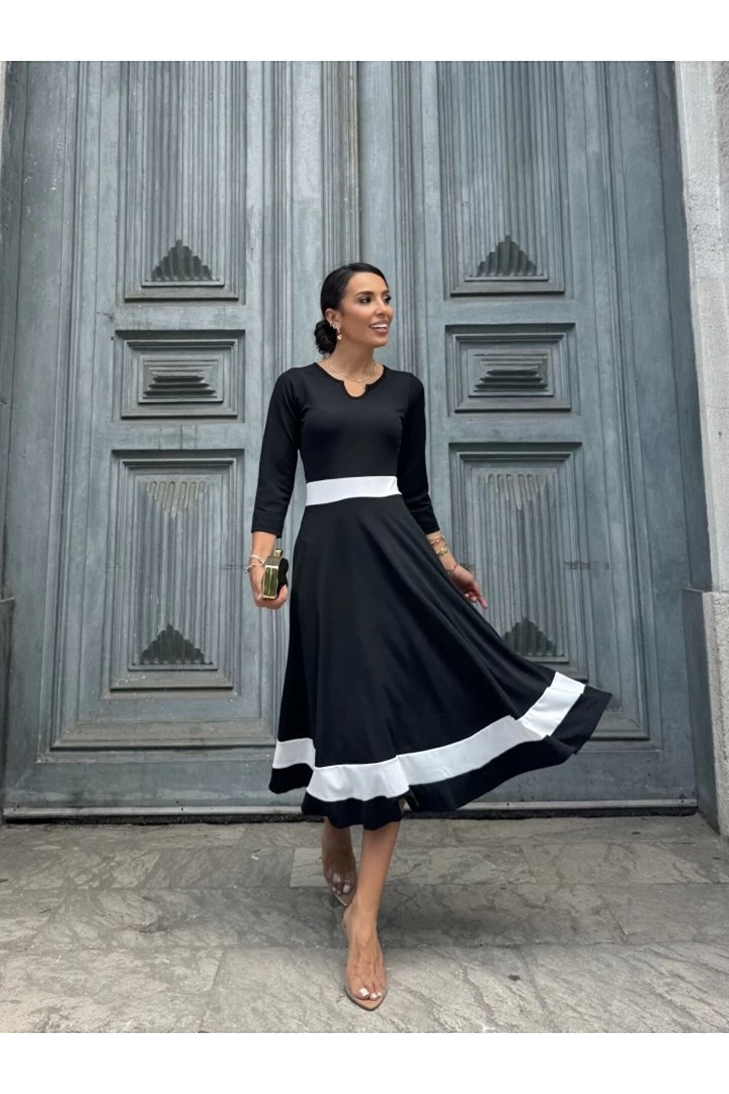 Kadın Truvakarkol Yakası Açık Blok Renkli Krep Midi Elbise