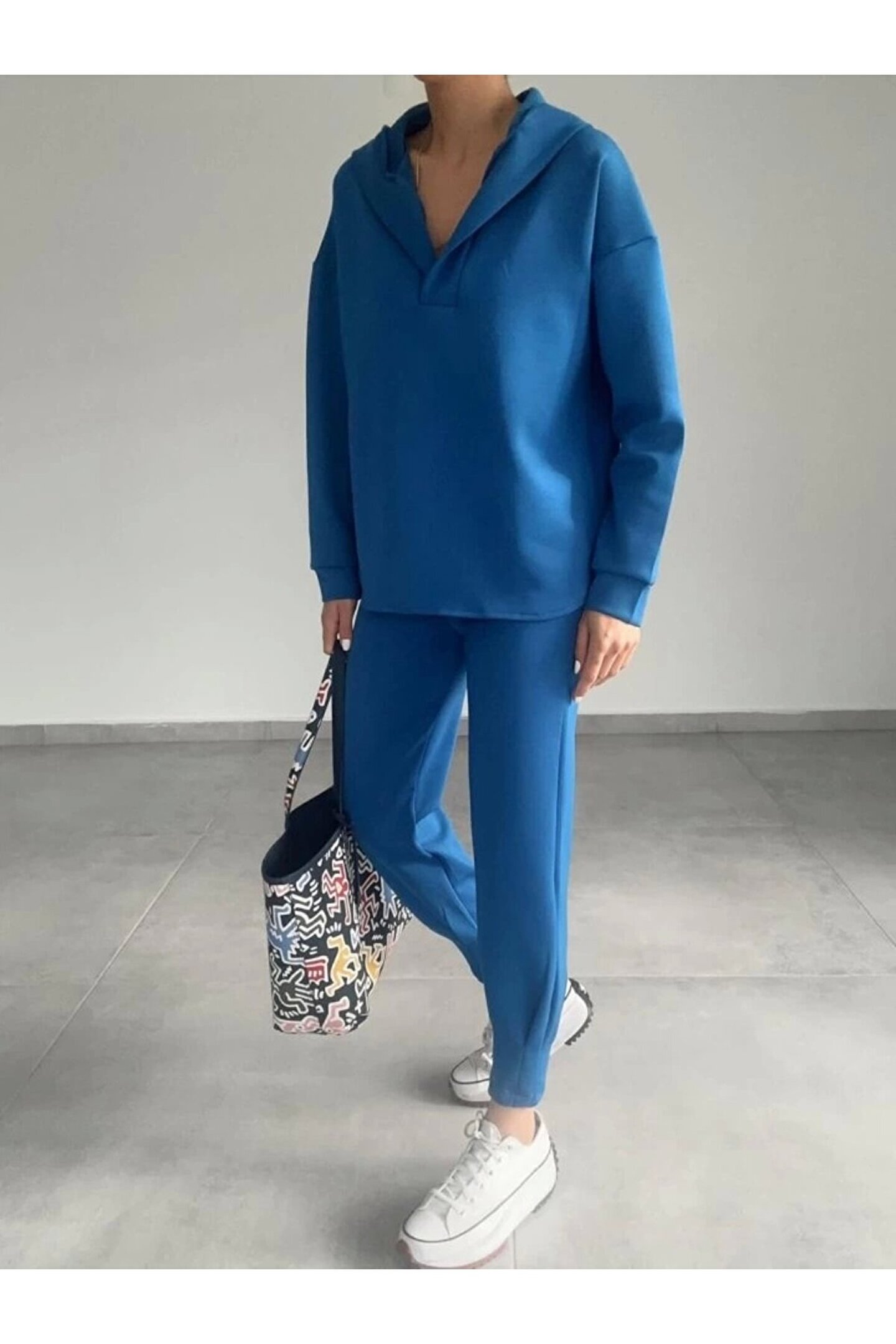 Kadın Uzun Kol V Yaka Kapüşon Detay weat Ve Yüksel Bel Eşofman Ikili Takım