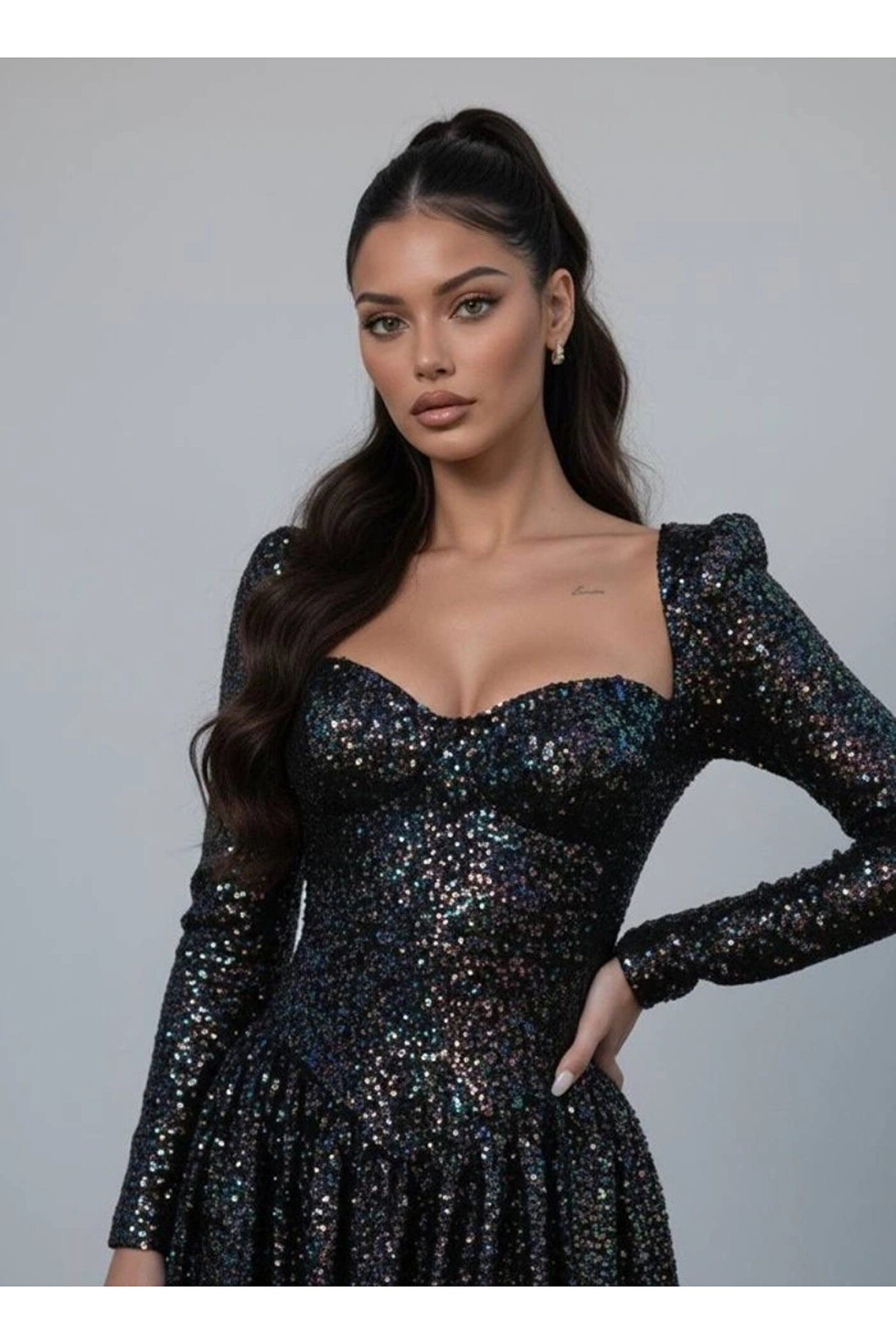Kadın Uzun Kollu Armut Yaka Pul Payet Işlemeli Mini Gece Elbisesi