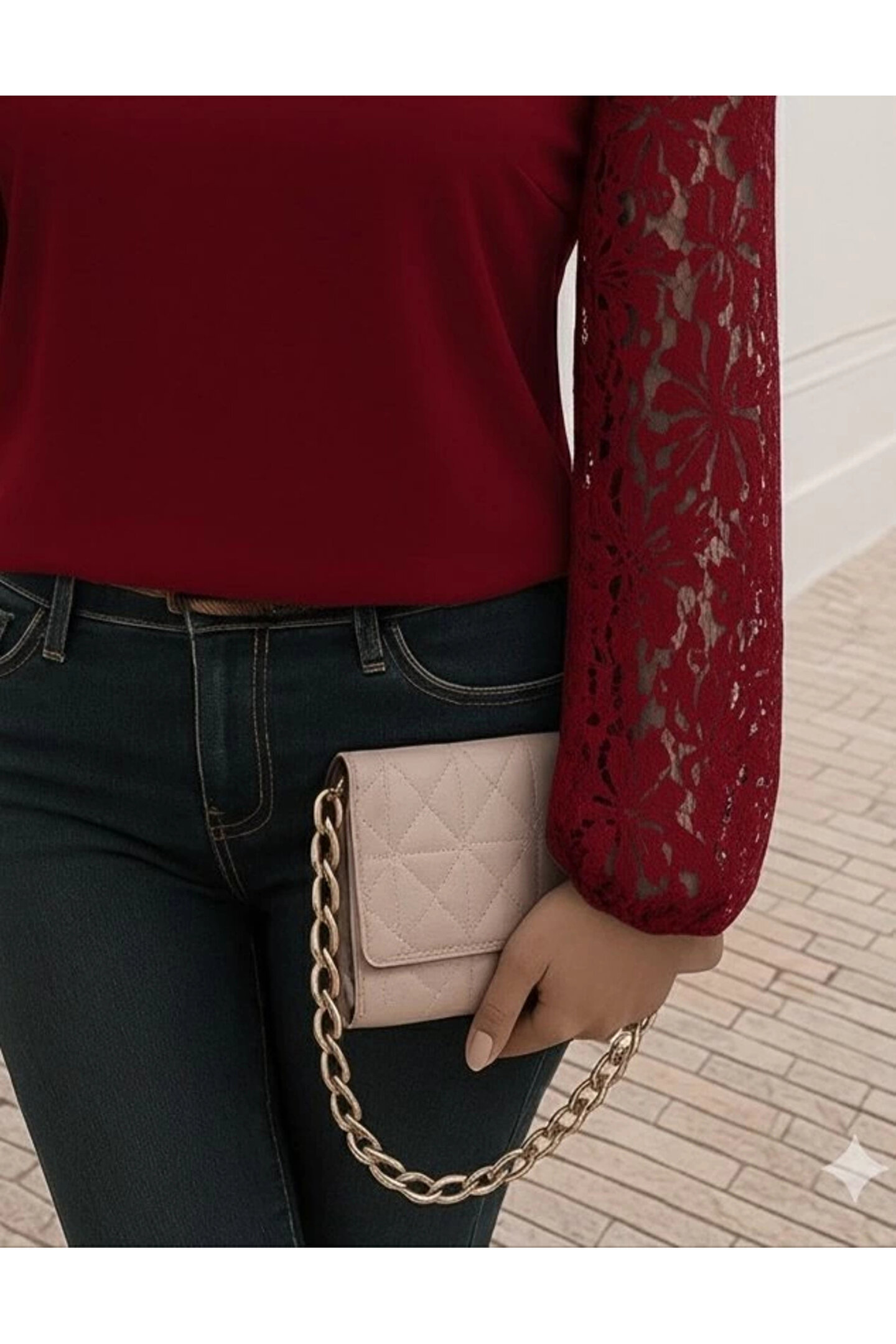 Kadın Uzun Kollu Asimetrik Yakalı Dantelli Ithal Krep Bluz