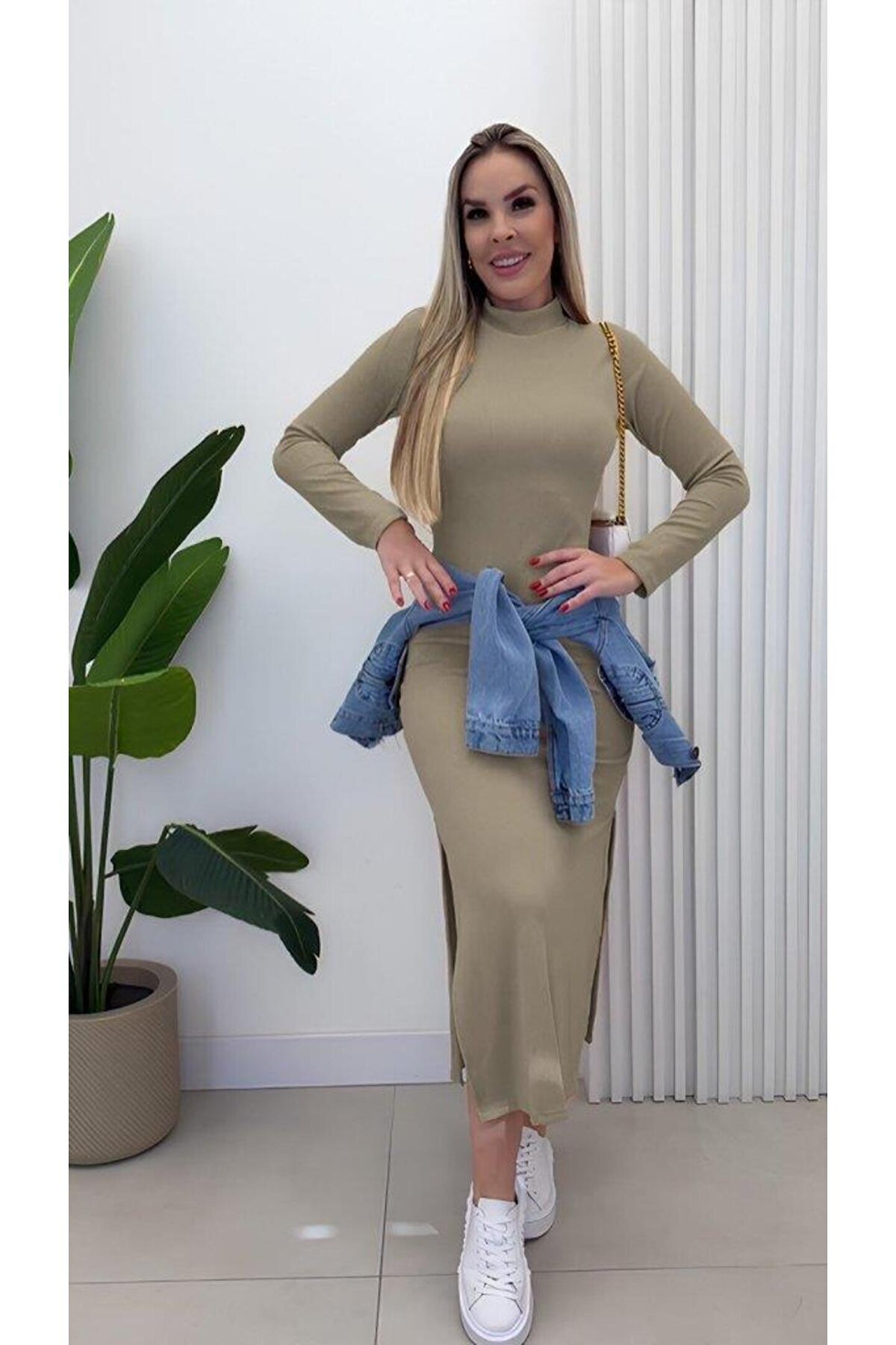 Silerra Kadın Uzun Kollu Balıkçı Yakalı Yanlardan Yırtmaçlı Kaşkorse Maxi Elbise