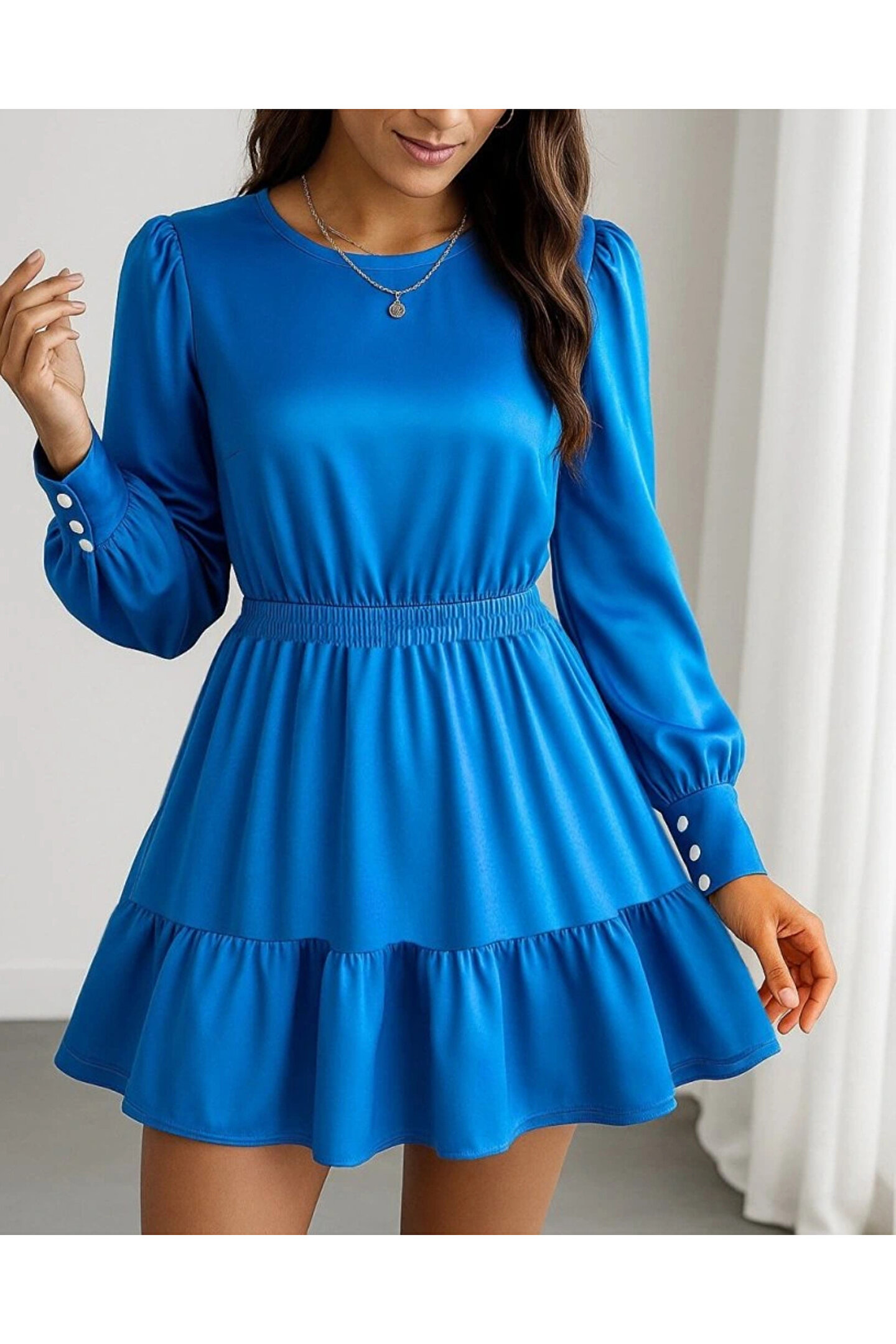 Kadın Uzun Kollu Bisiklet Yaka Beli Lastikli Fırfırlı Ithal Krep Elbise