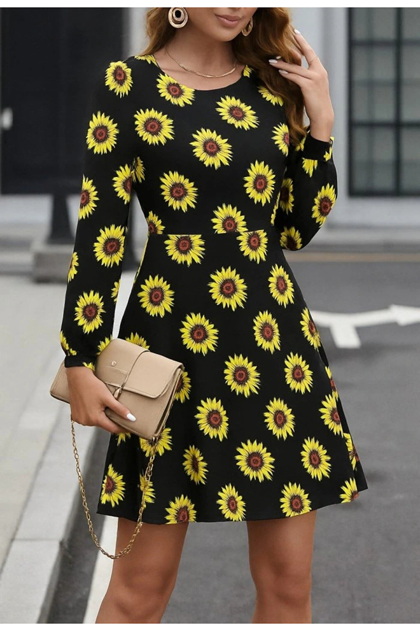 Kadın Uzun Kollu Bisiklet Yaka Desenli Kısa Krep Elbise
