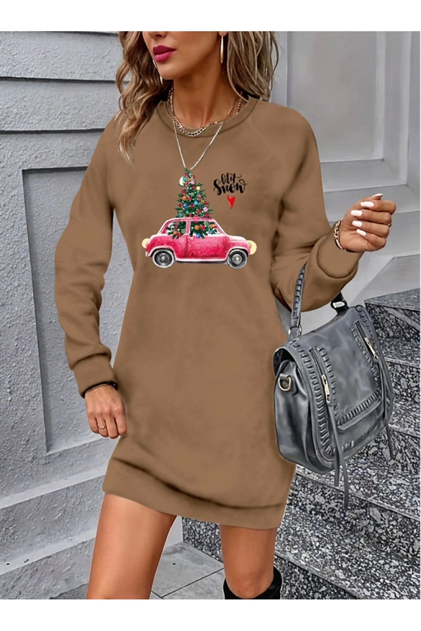 Kadın Uzun Kollu Bisiklet Yaka Desenli Viskon Iki Iplik Elbise