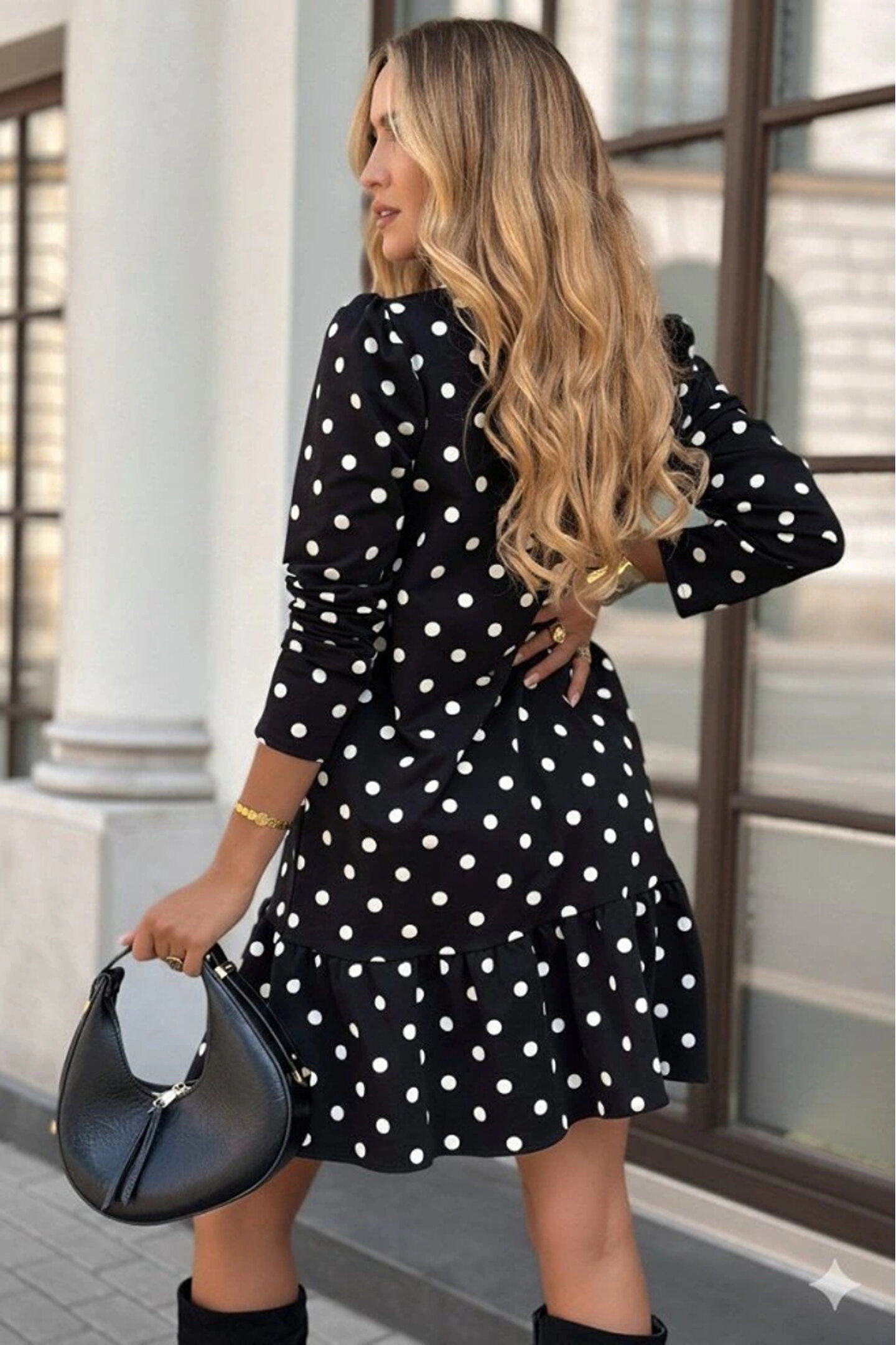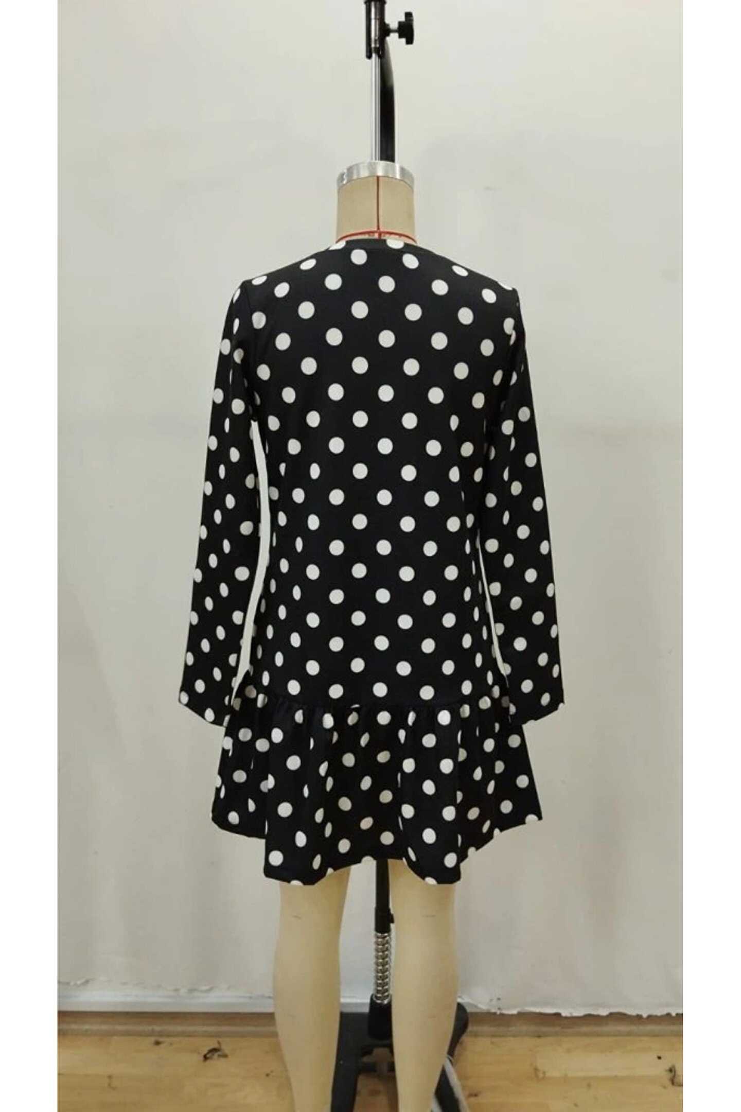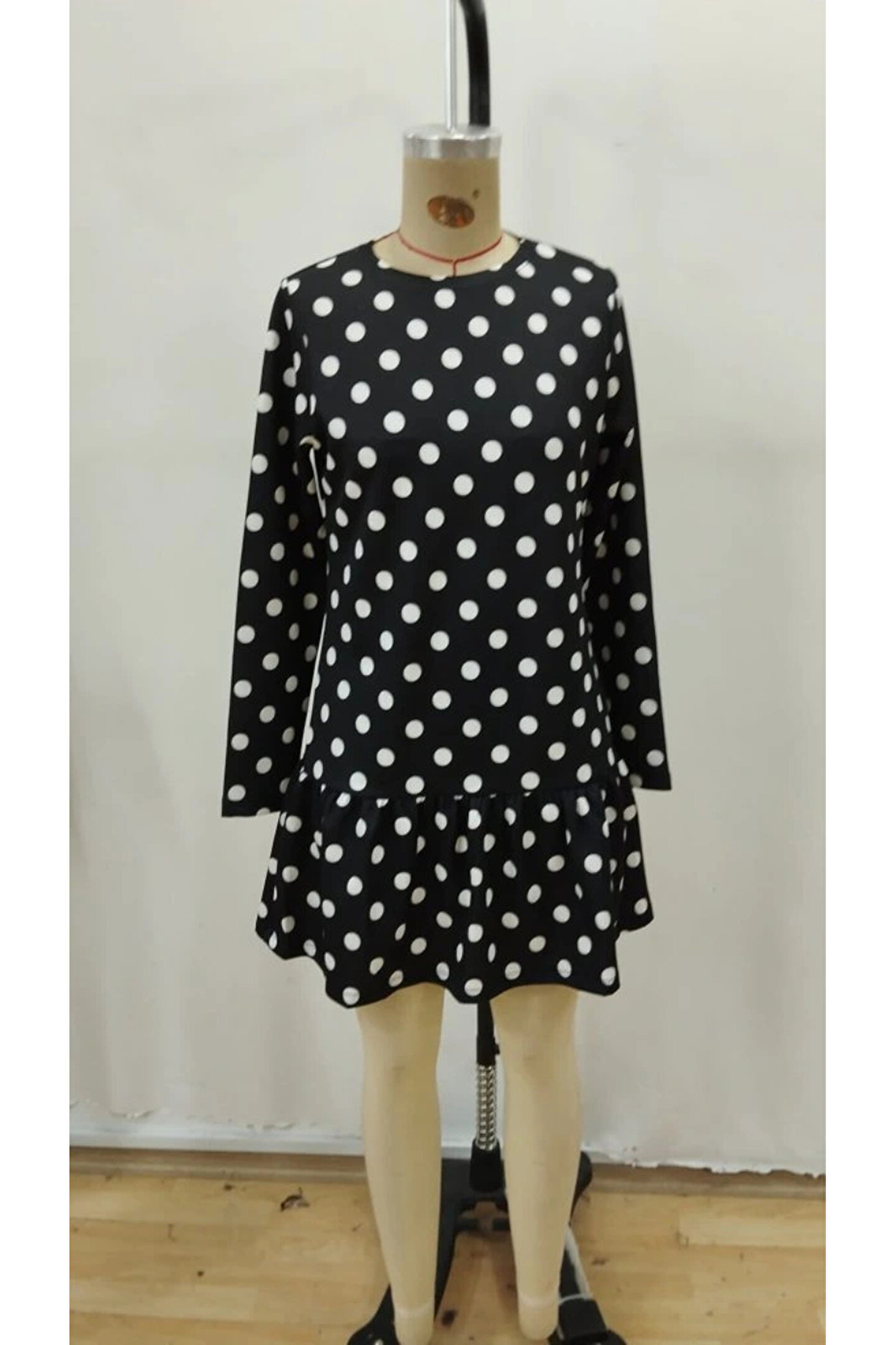 Kadın Uzun Kollu Bisiklet Yaka Fırfırlı Puantiyeli Kısa Modal Elbise