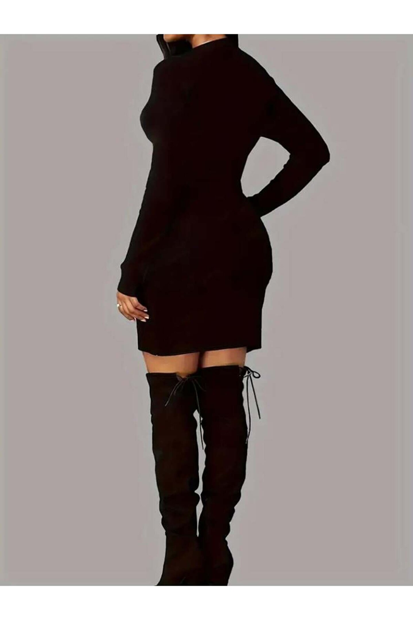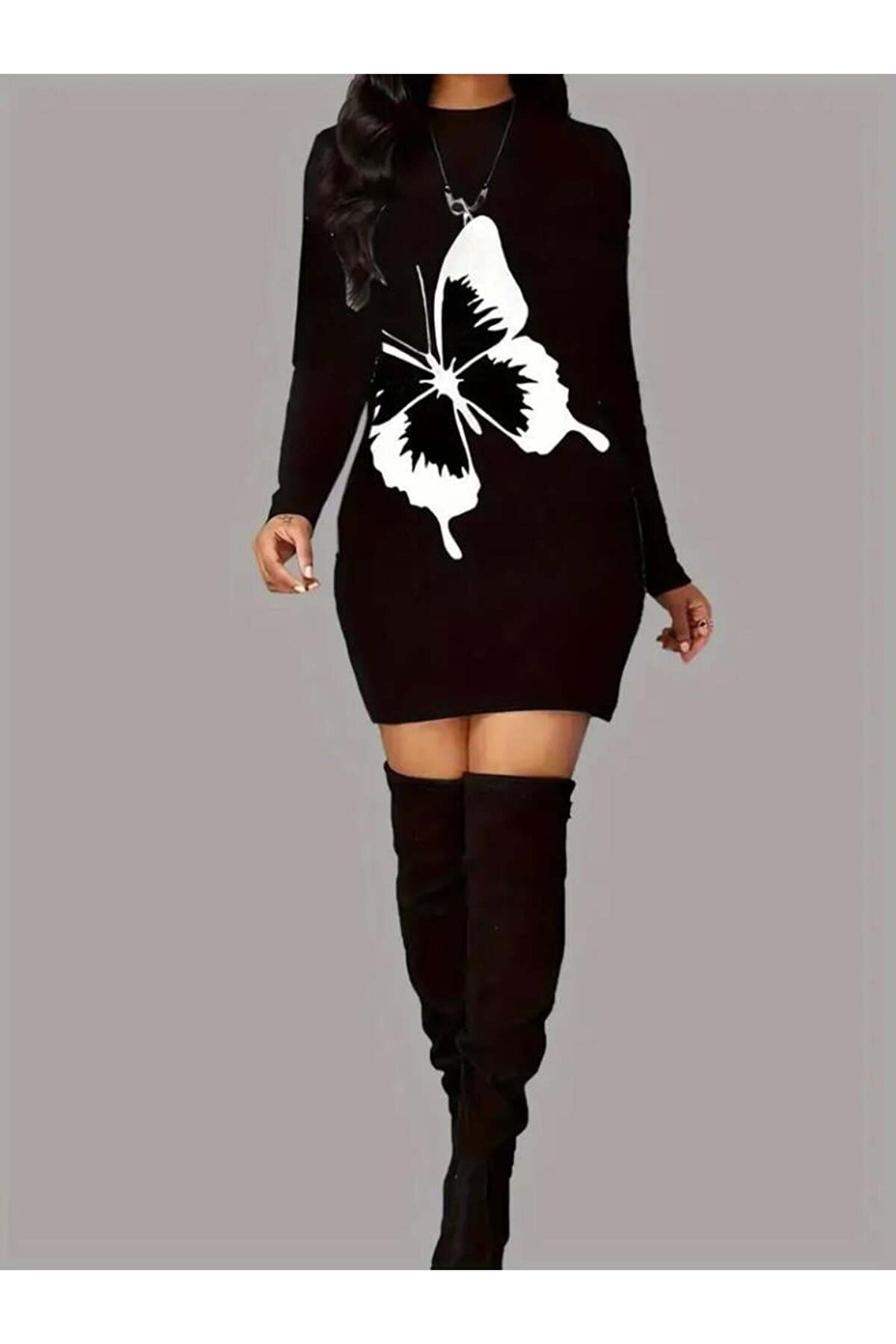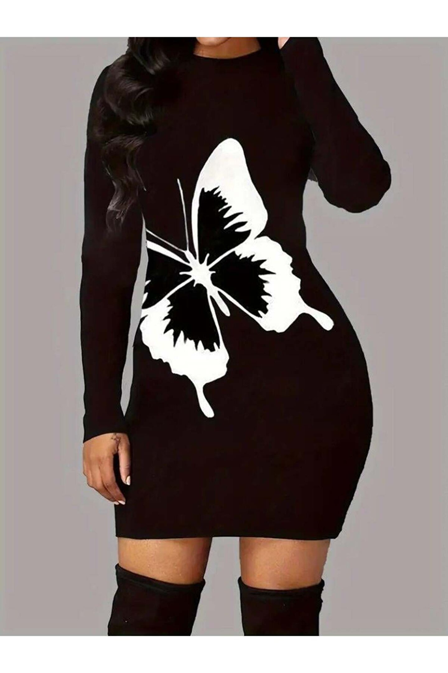 Kadın Uzun Kollu Bisiklet Yaka Kelebek Desenli Kısa Viskon Iki Iplik Elbise