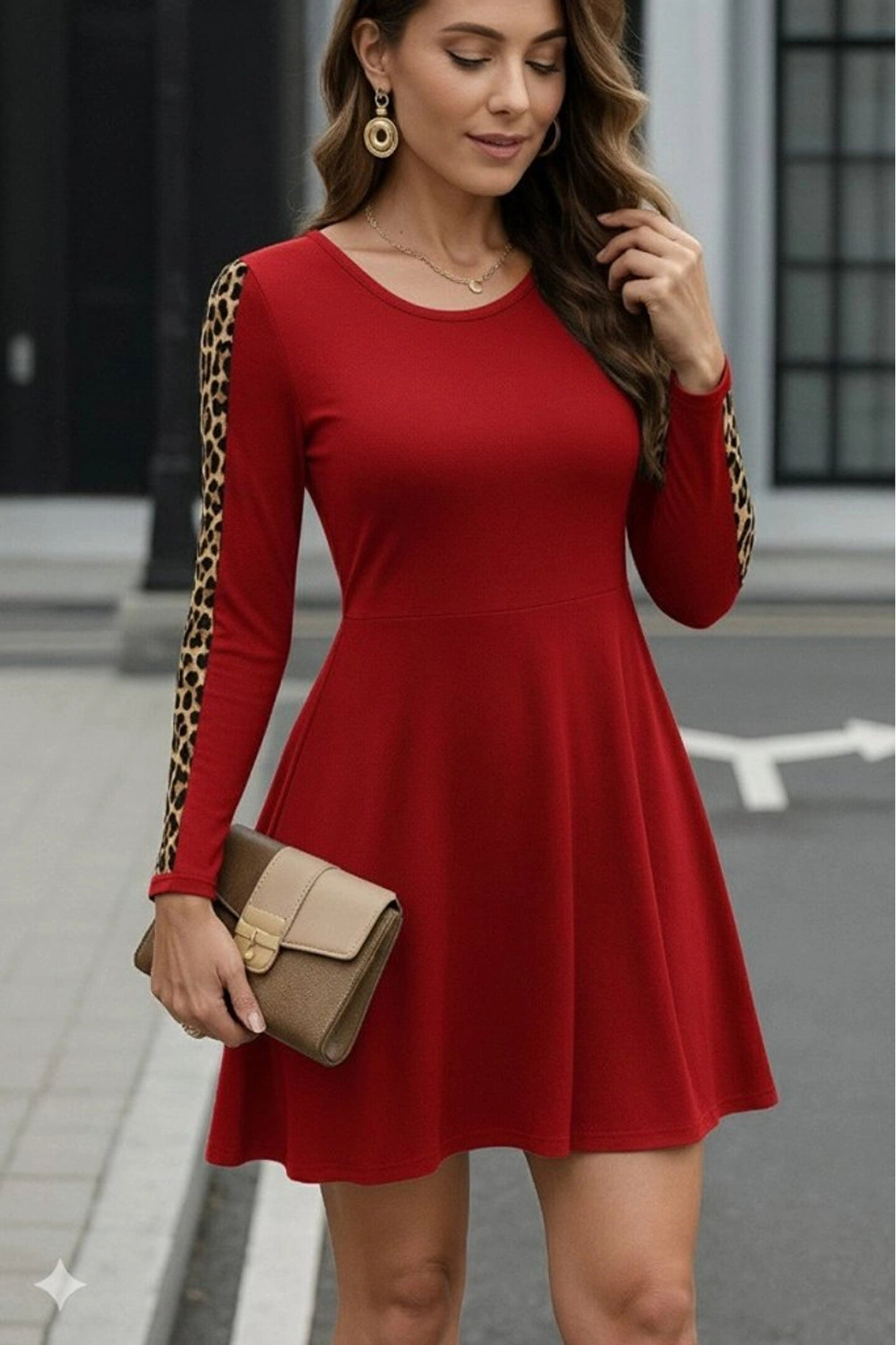 Kadın Uzun Kollu Bisiklet Yaka Kollar Leopar Detay Iki Iplik Mini Boy Elbise
