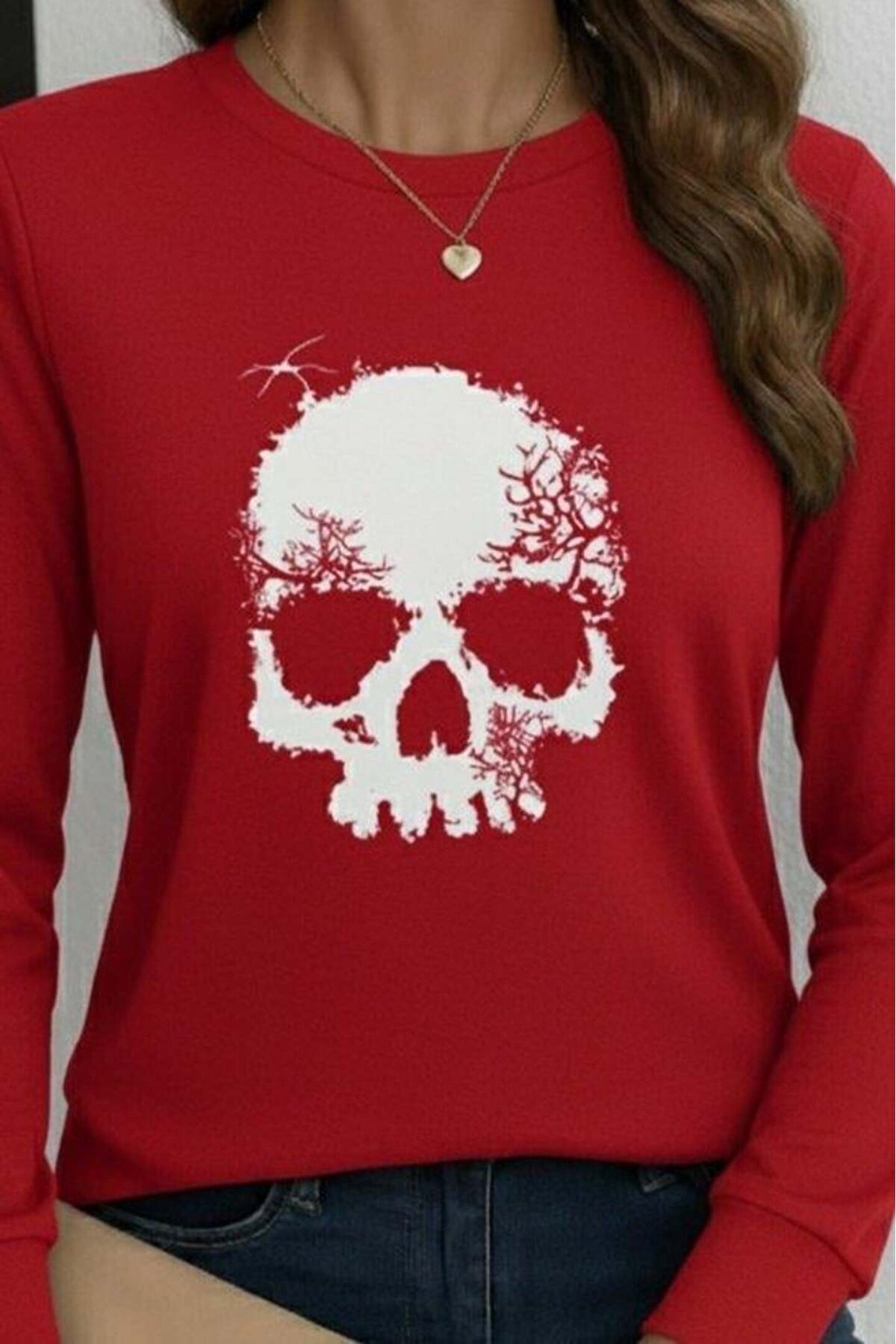 Kadın Uzun Kollu Bisiklet Yaka Kurukafa Desenli Viskon Bluz