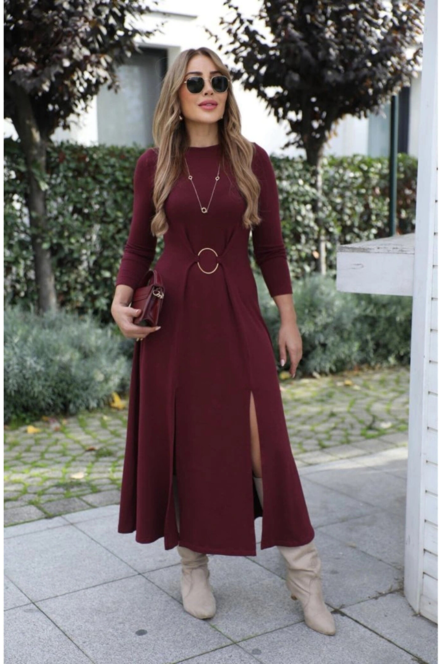 Kadın Uzun Kollu Bisiklet Yaka önden Halka Detaylı Yırtmaçlı Uzun Viskon Iki Iplik Elbise