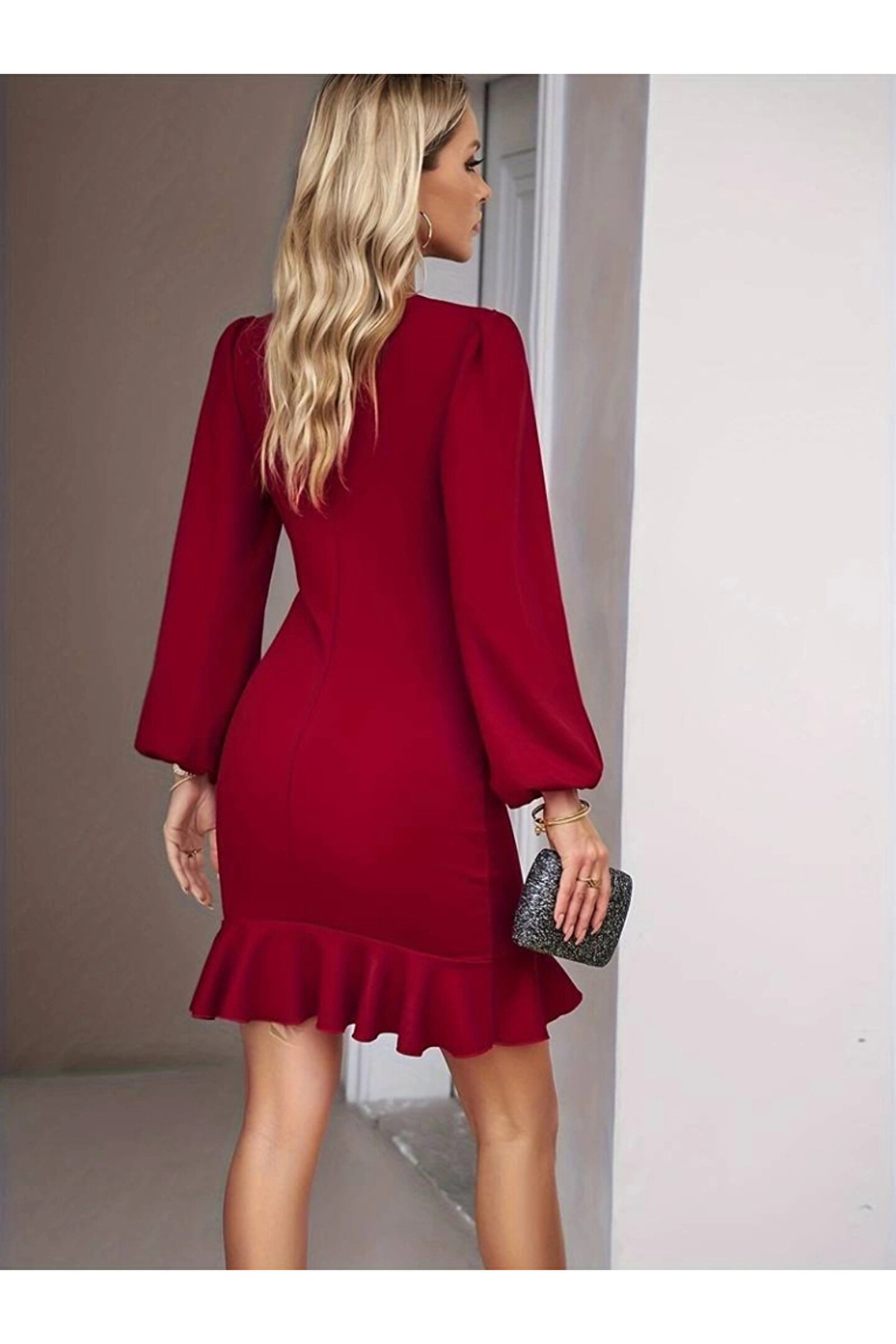Kadın Uzun Kollu Bisiklet Yaka önden Volanlı Ithal Krep Elbise