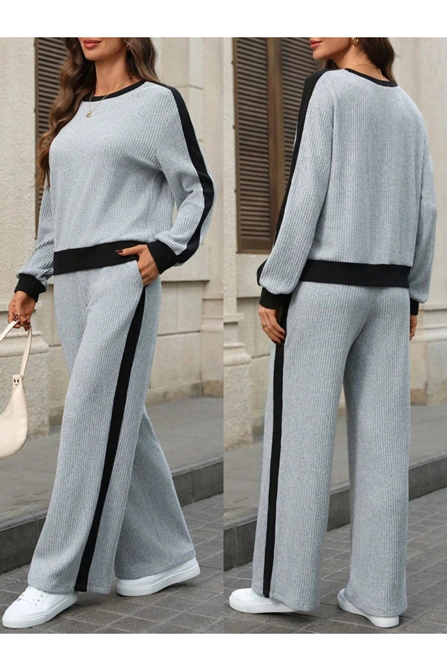 Kadın Uzun Kollu Bisiklet Yaka şardonlu Kaşkorse Bluz Ve Pantolon Ikili Takım