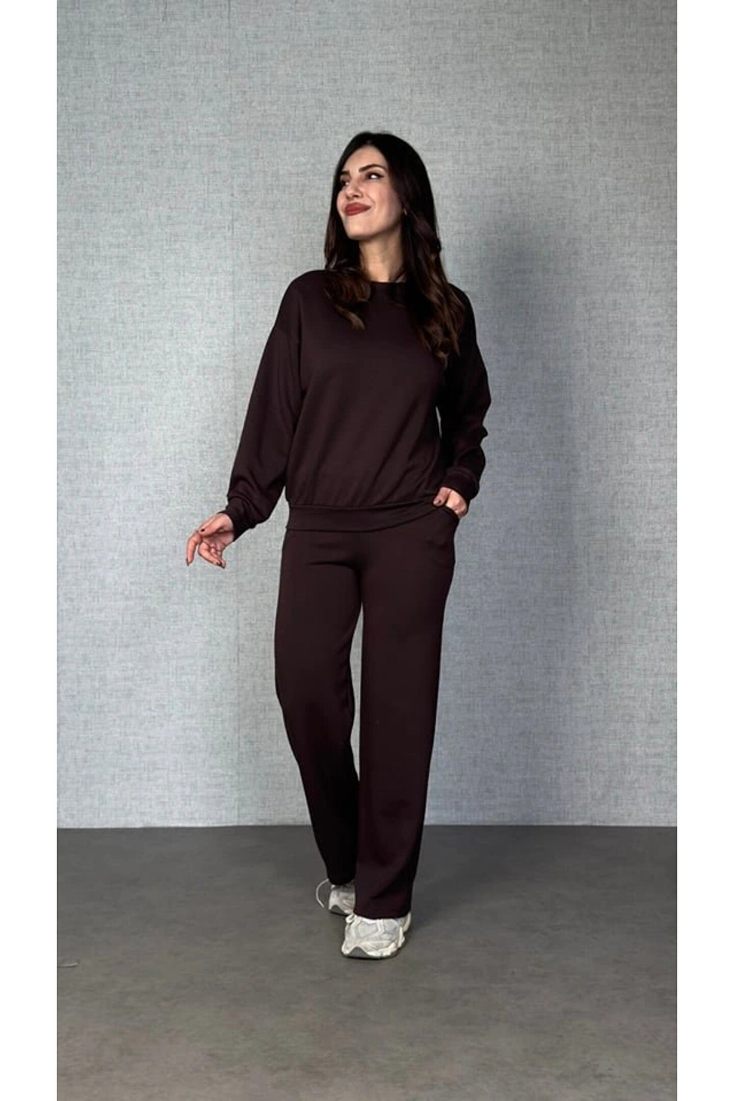 Kadın Uzun Kollu Bisiklet Yaka Viskon Iki Iplik Bluz Ve Pantolon Ikili Takım
