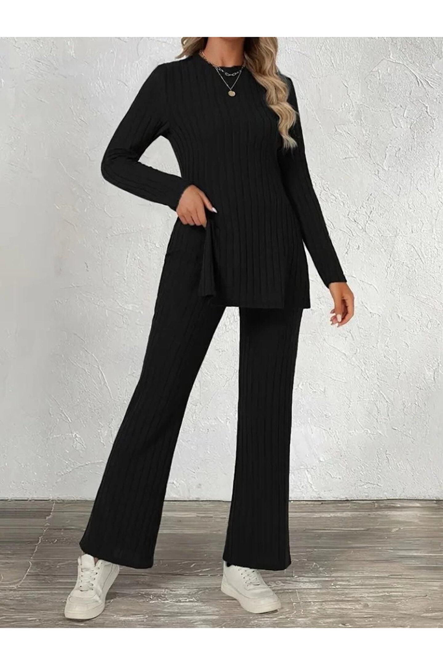 Kadın Uzun Kollu Bisiklet Yaka Yandan Yırtmaçlı şardonlu Kaşkorse Bluz Ve Pantolon Ikili Takım
