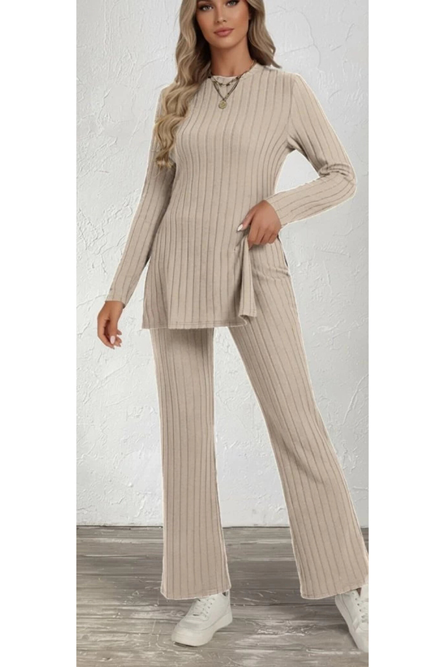 Kadın Uzun Kollu Bisiklet Yaka Yandan Yırtmaçlı şardonlu Kaşkorse Bluz Ve Pantolon Ikili Takım