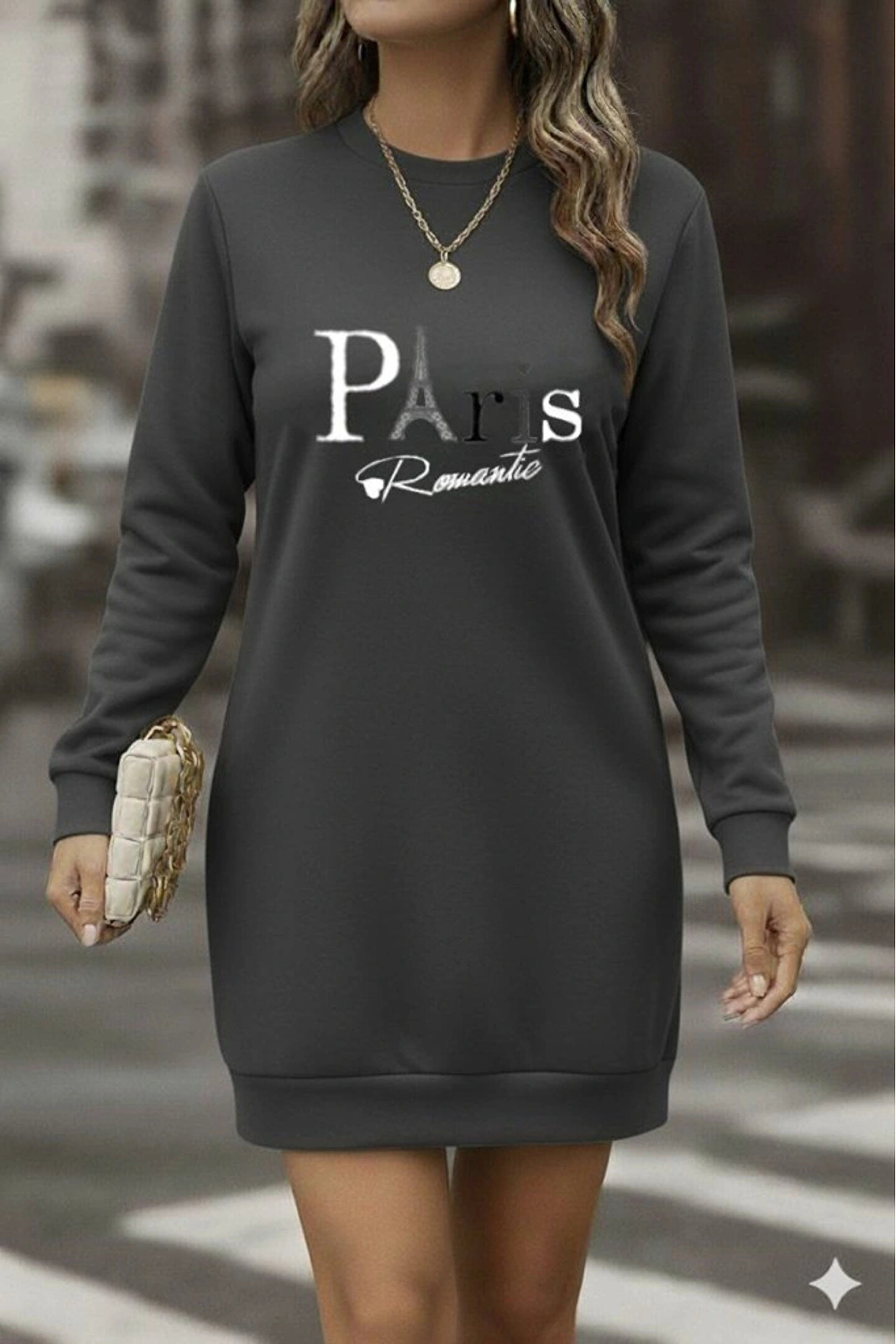 Kadın Uzun Kollu Bisiklet Yaka Yazılı Kısa Viskon Iki Iplik Elbise