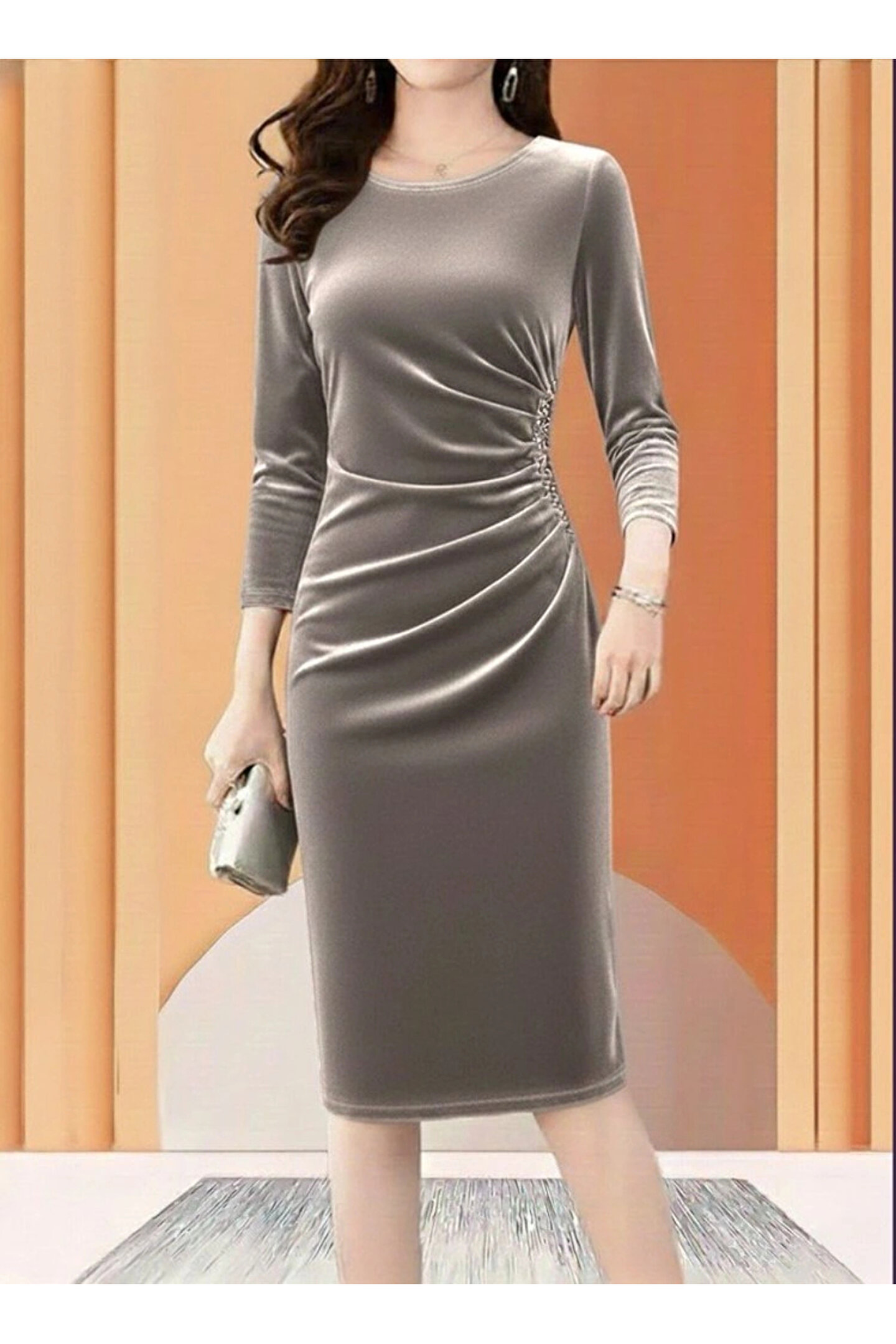 Kadın Uzun Kollu Bot Yaka Yanı Taş Detaylı Midi Kadife Elbise