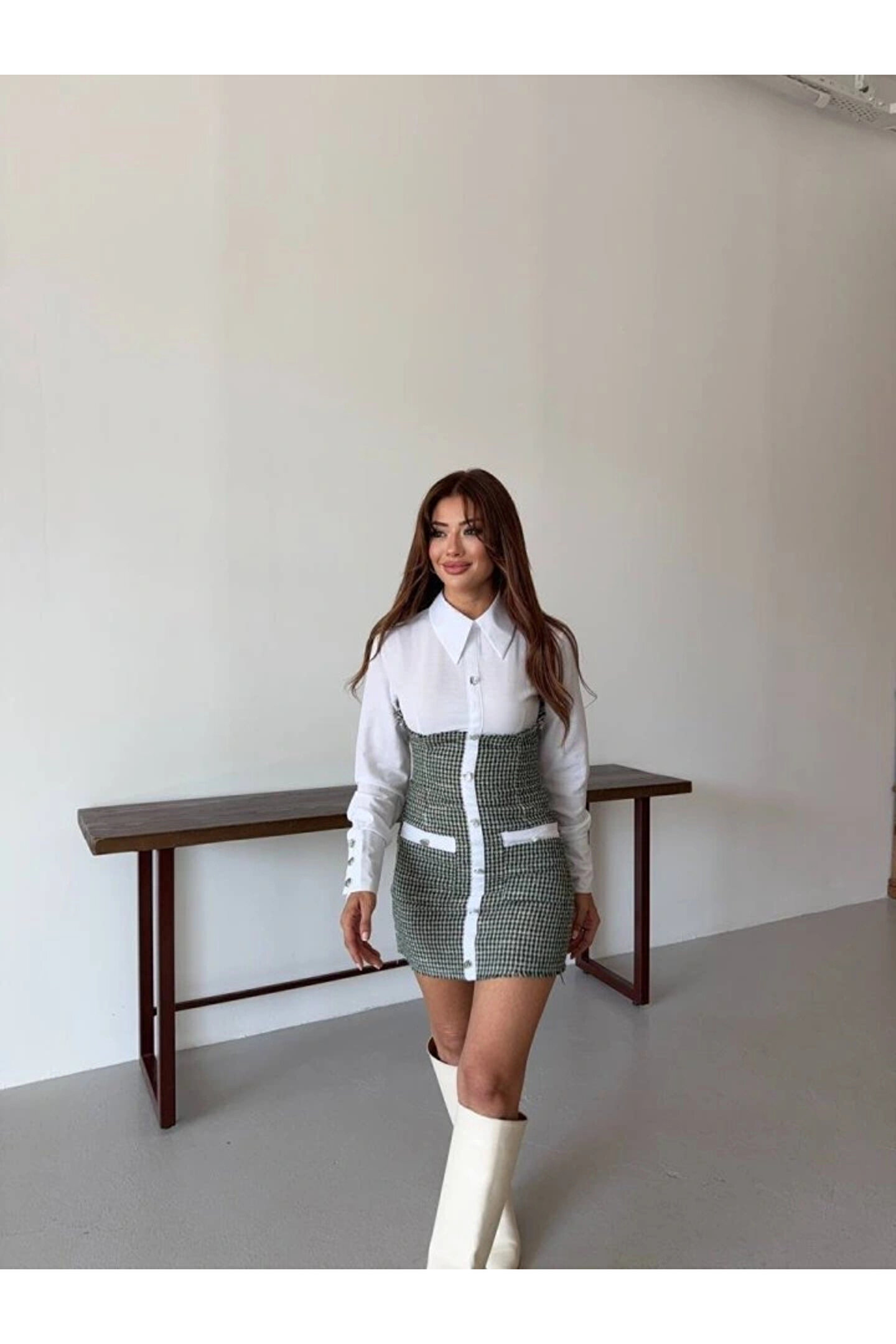 KADIN UZUN KOLLU CEP VE DÜĞME DETAY MİNİ GÖMLEK ELBİSE