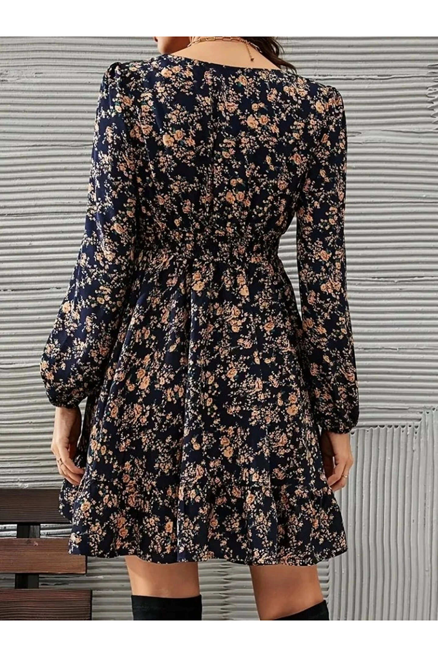 Kadın Uzun Kollu Dantel V Yakalı Mini Desenli Süprem Elbise