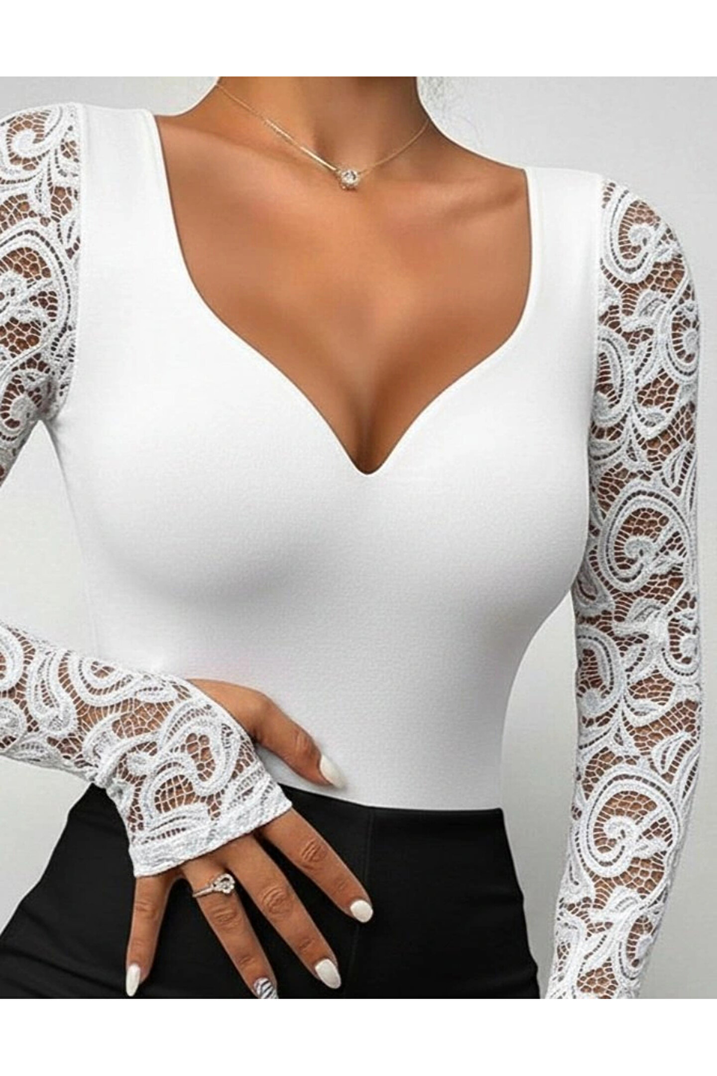 Kadın Uzun Kollu Dantelli Dekolte Detaylı Dalgıç Bluz