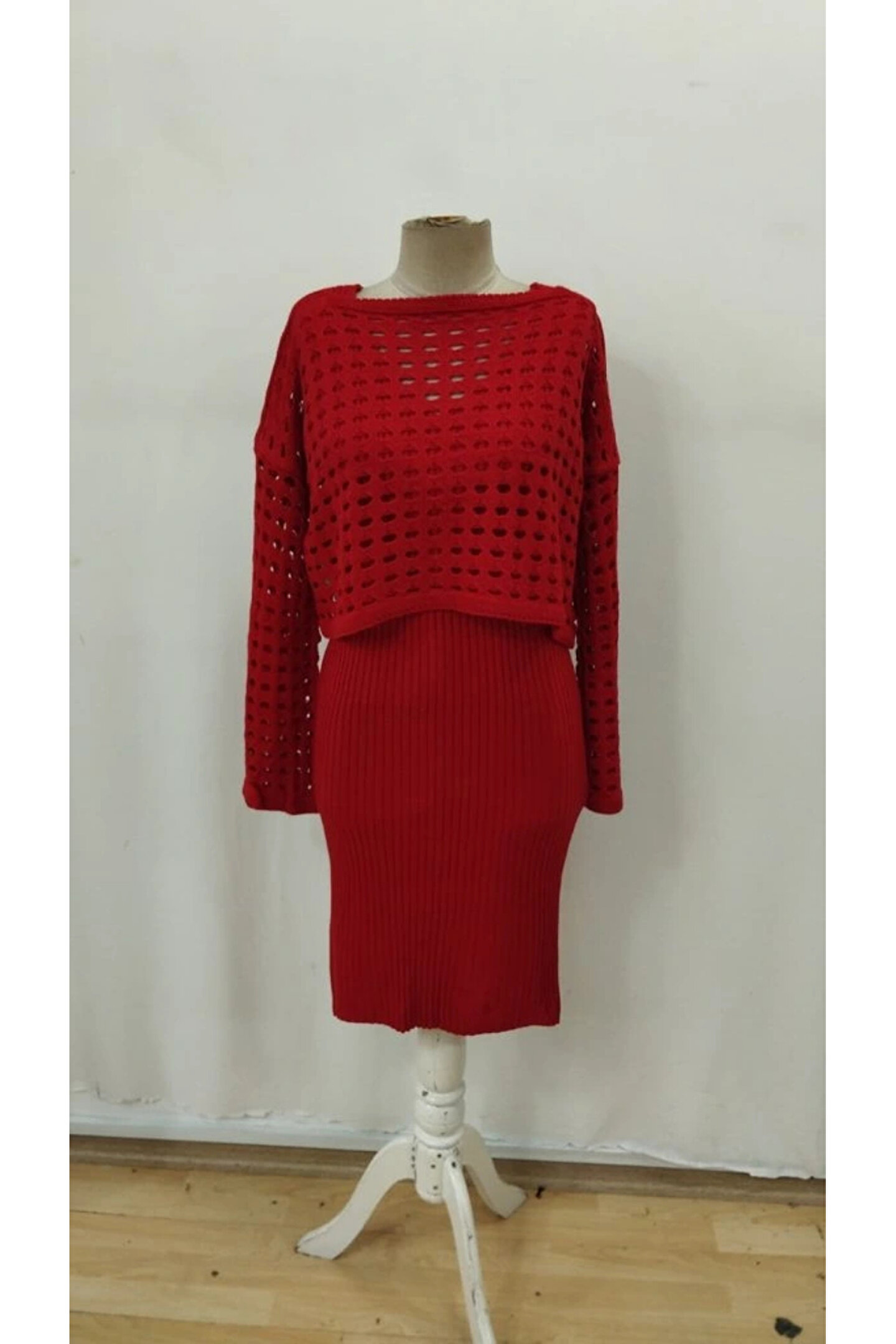 Kadın Uzun Kollu Delikli Kazak Askılı Elbise Triko Ikili Takım