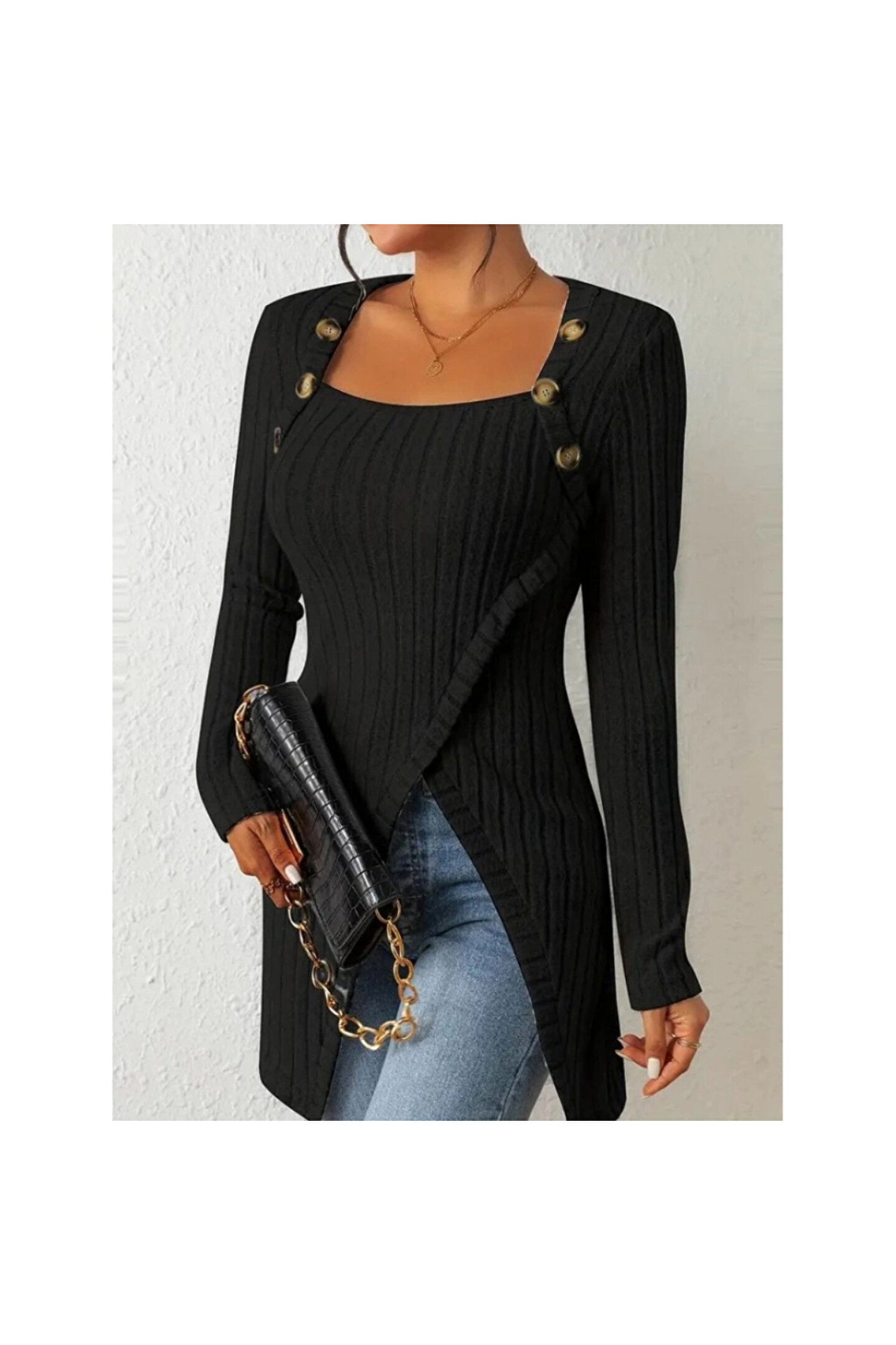 Silerra Kadın Uzun Kollu Derin Kare Yaka Düğme Detay şardonlu Kaşkorse Kruvaze Bluz